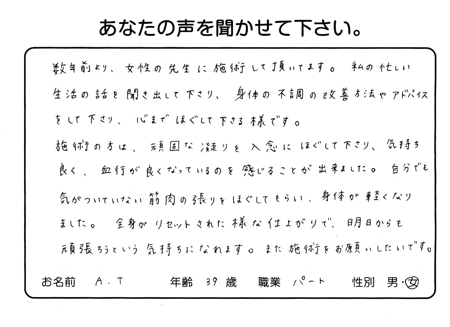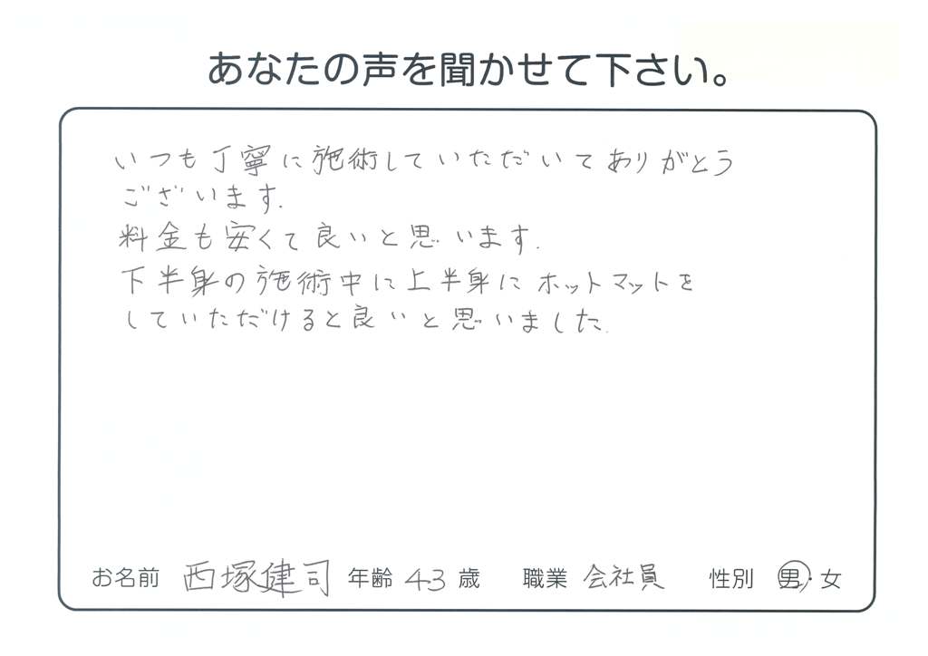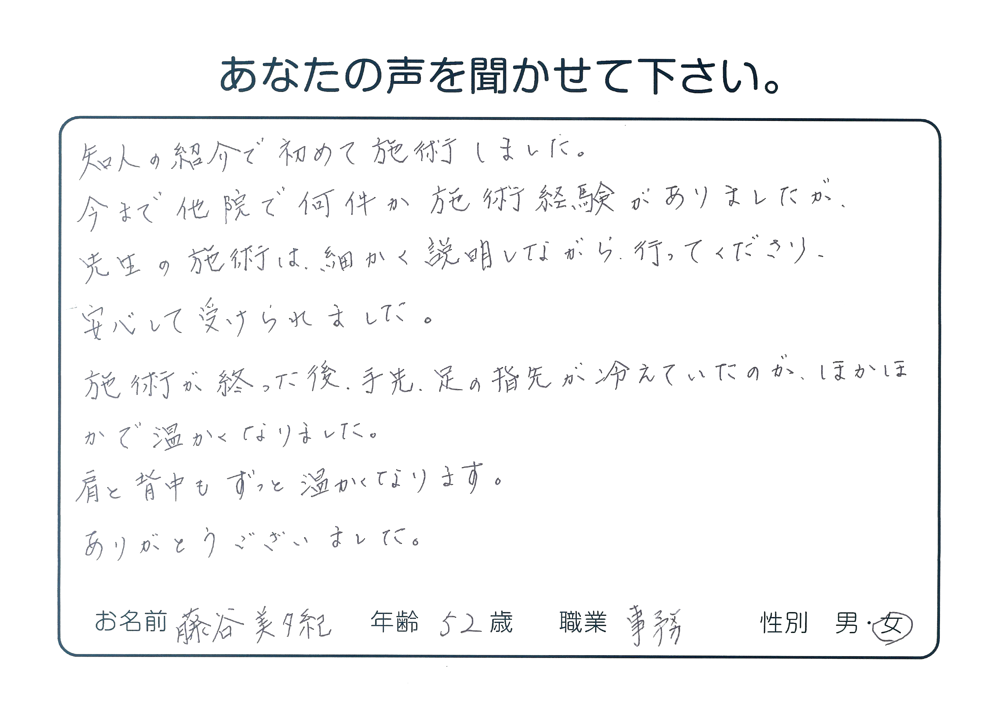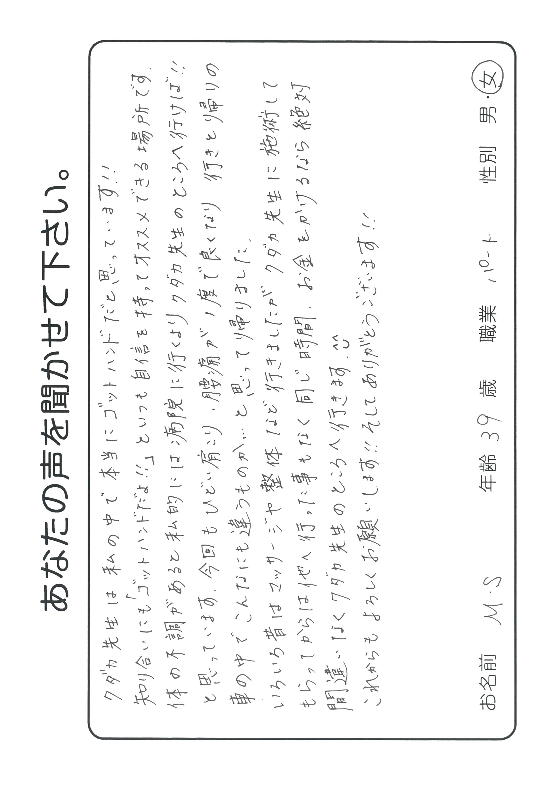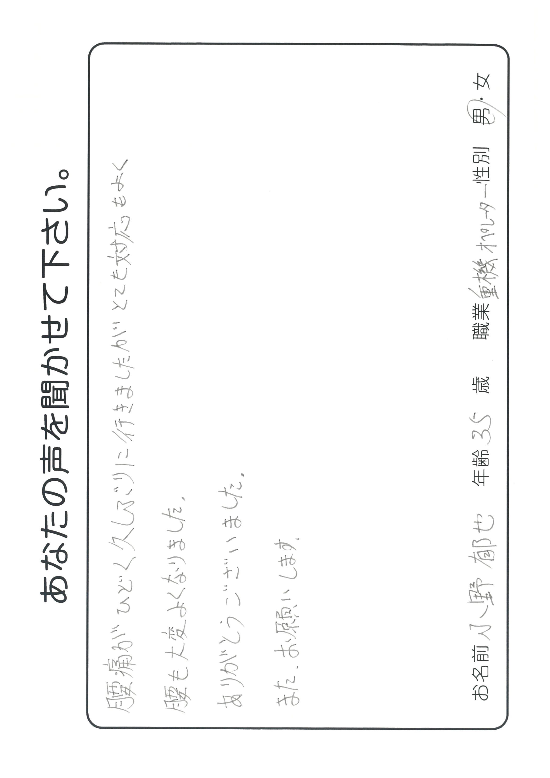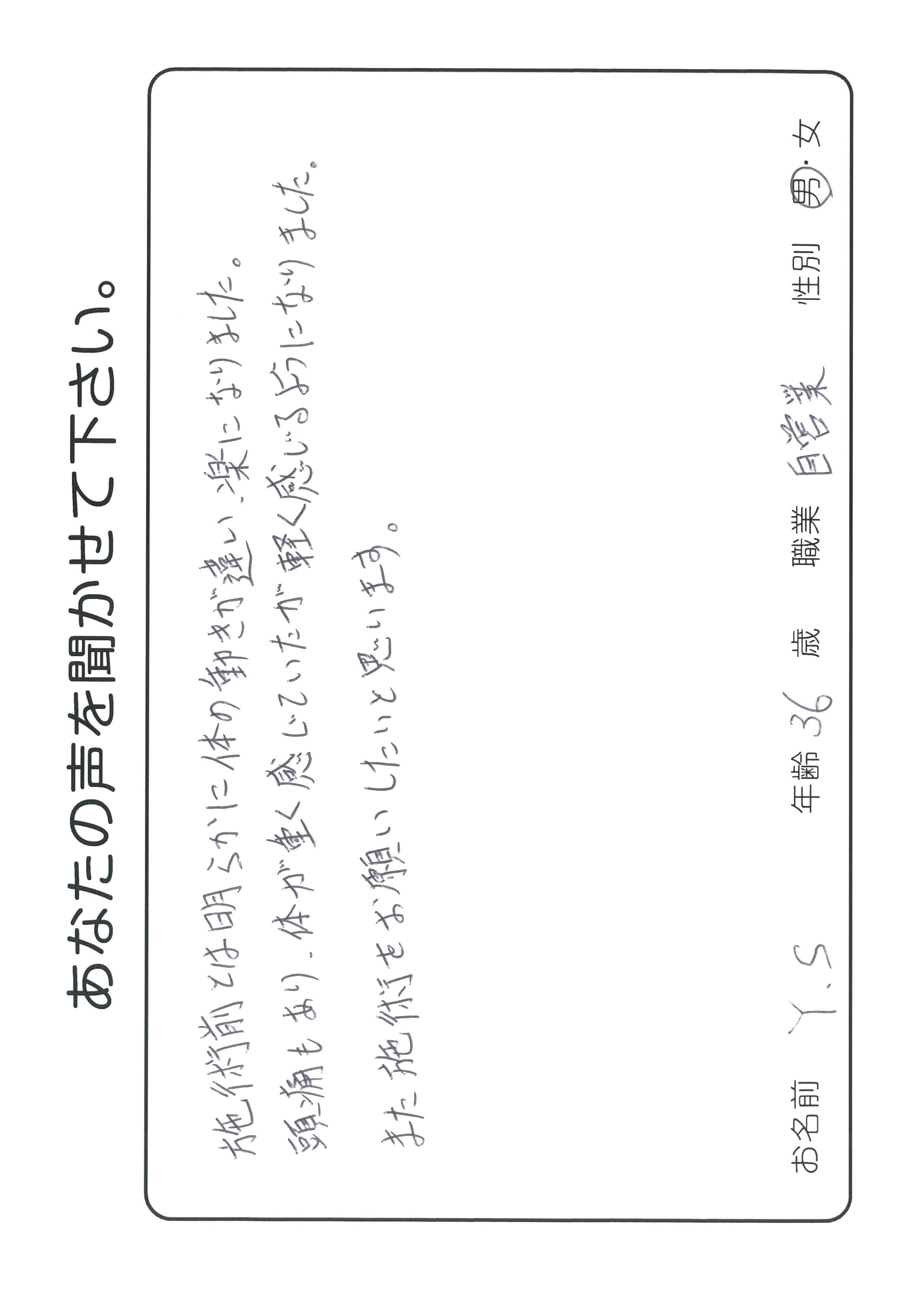 たくさんのお言葉ありがとうございます。実際に見て感じた事を言葉に表す事って簡単な事ではないですね!みなさん一生懸命に書いていただいた事が無駄にならないよう施術させていただきます。