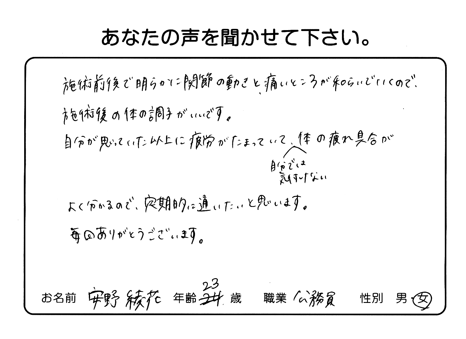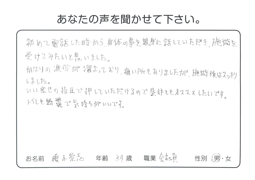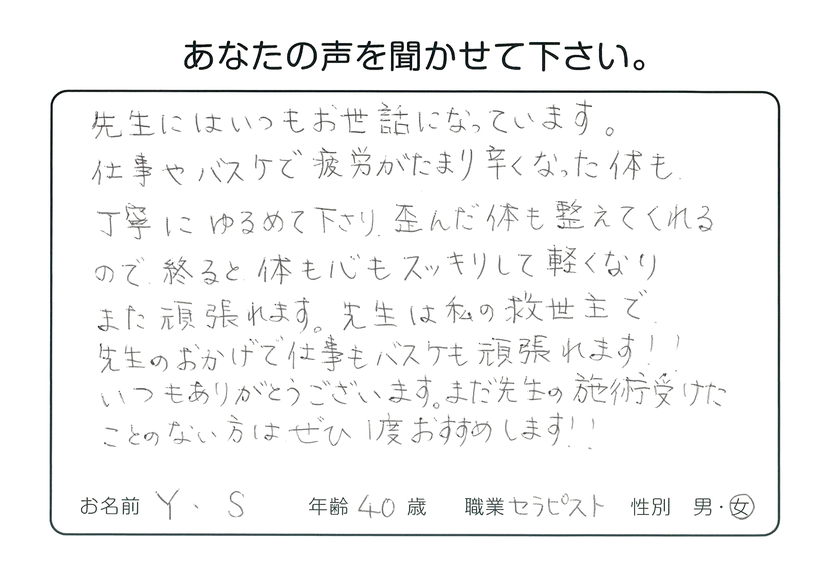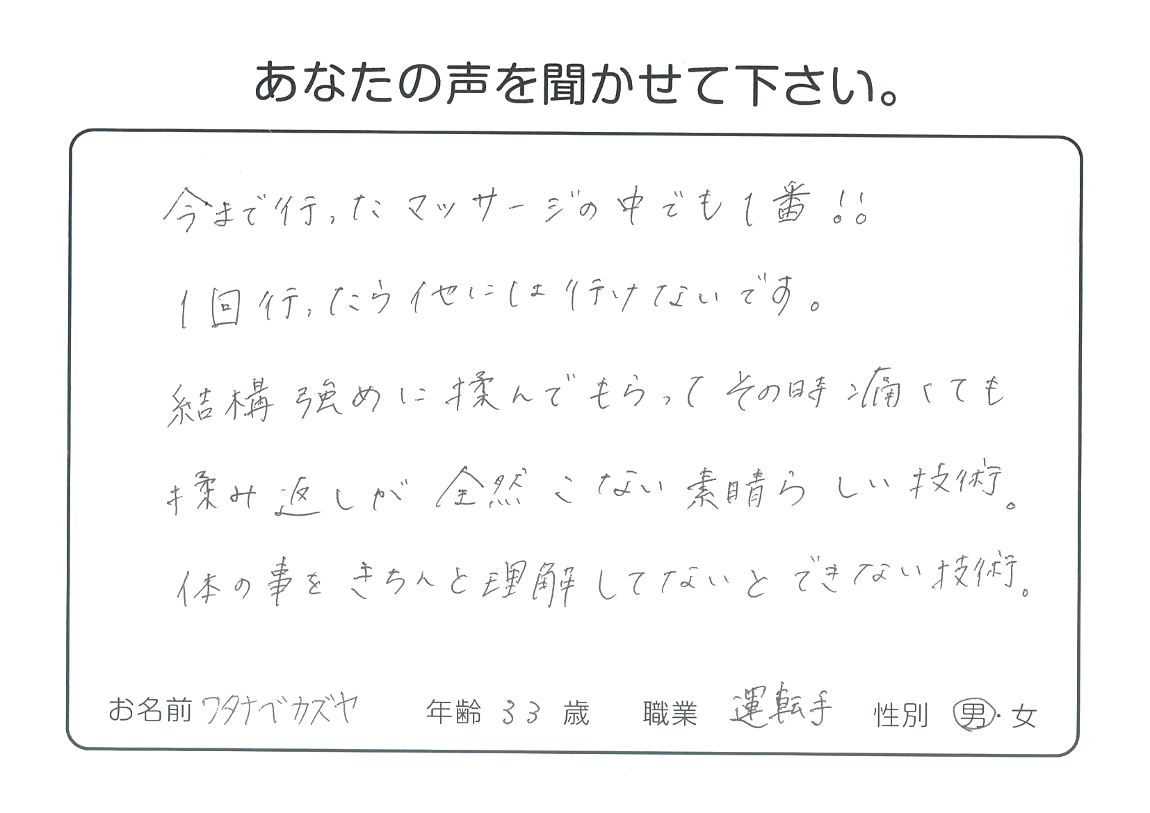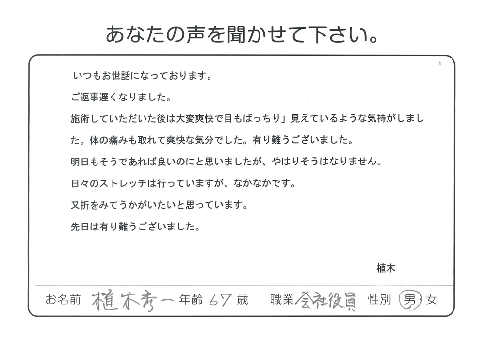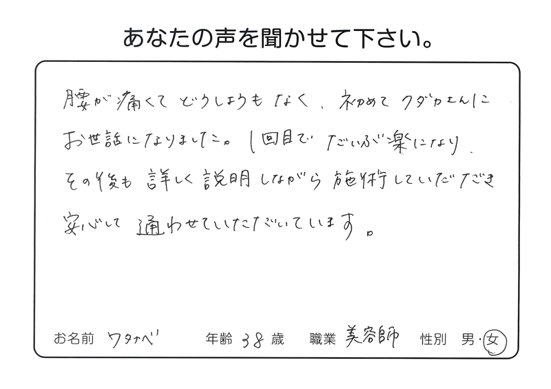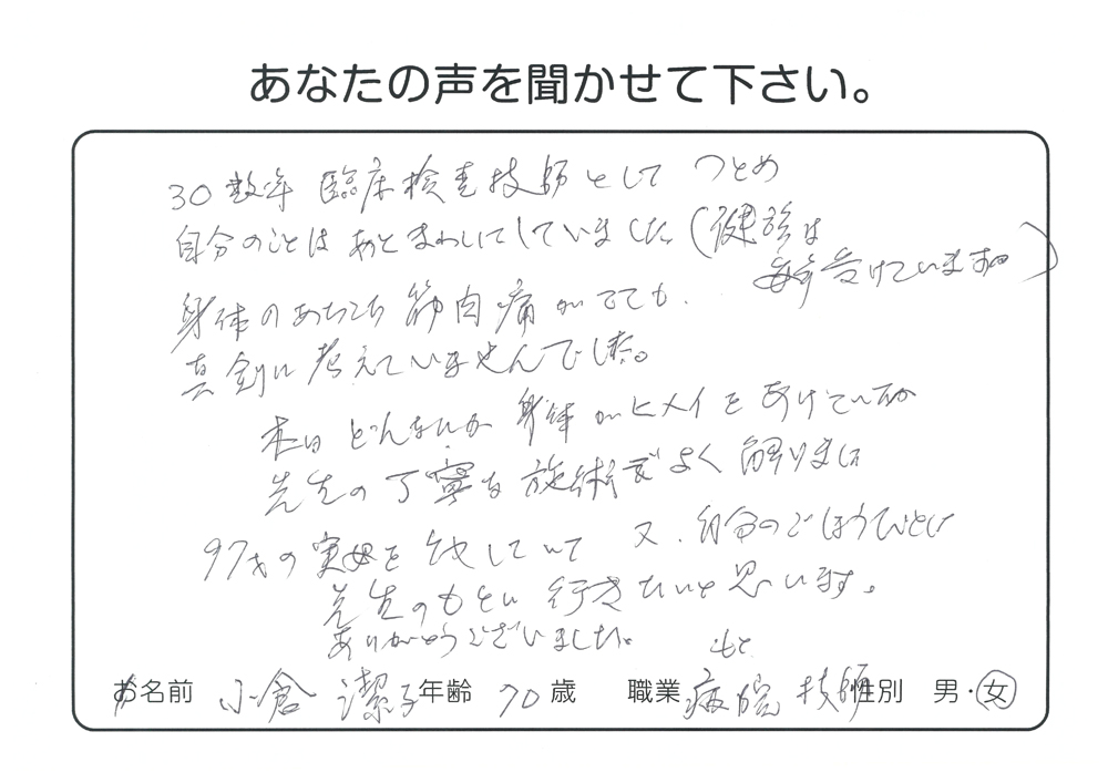 たくさんのお言葉ありがとうございます。実際に見て感じた事を言葉に表す事って簡単な事ではないですね!みなさん一生懸命に書いていただいた事が無駄にならないよう施術させていただきます。