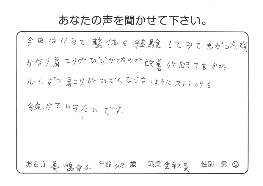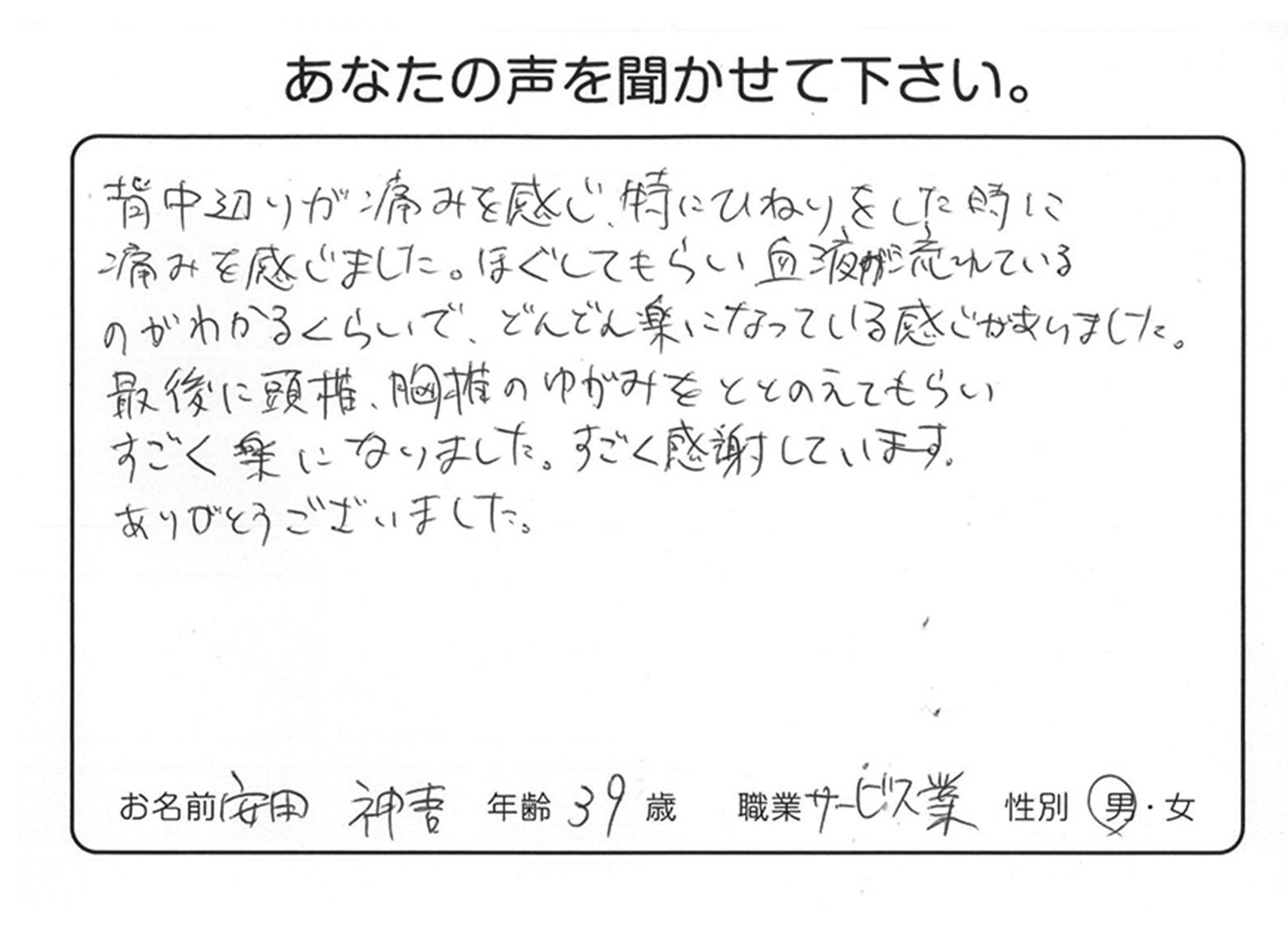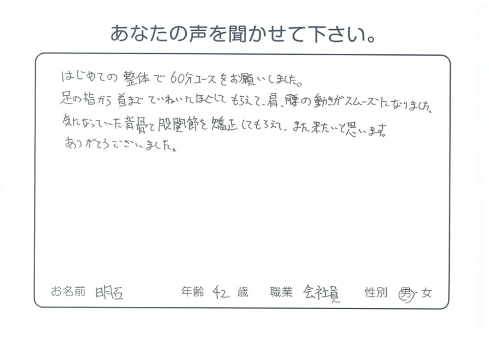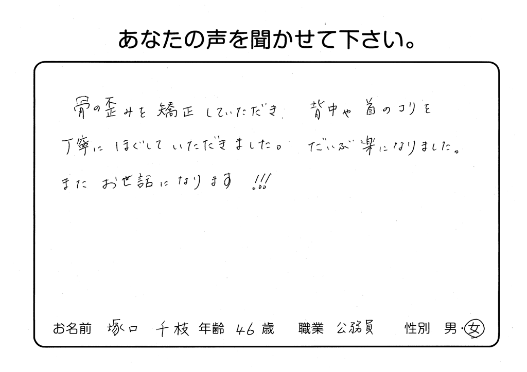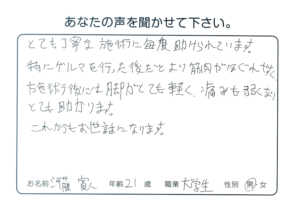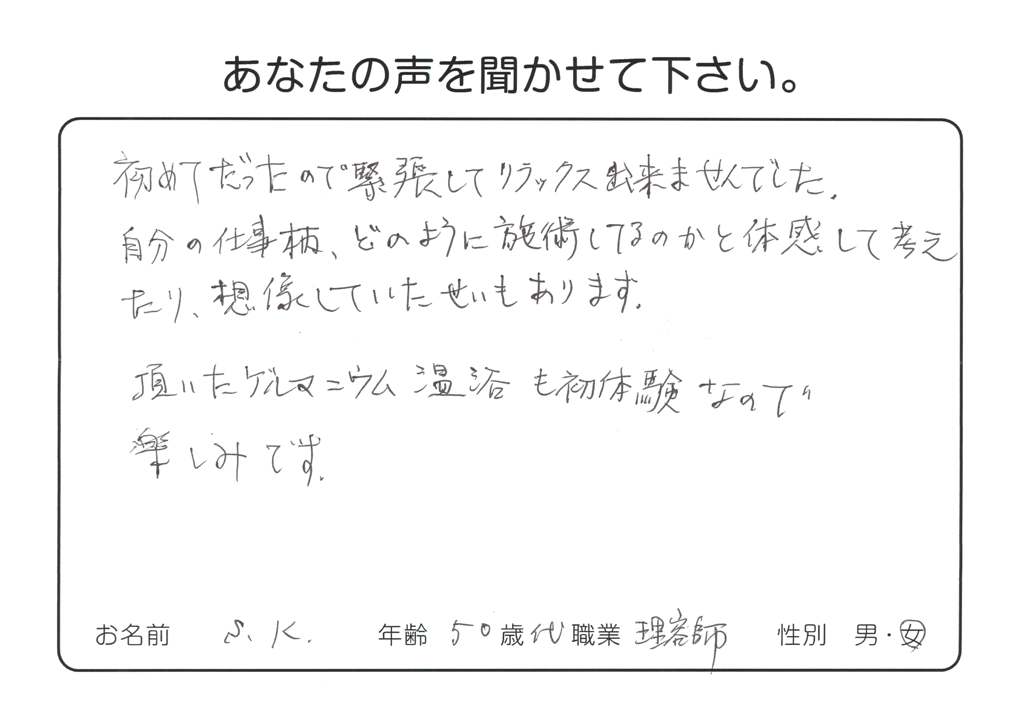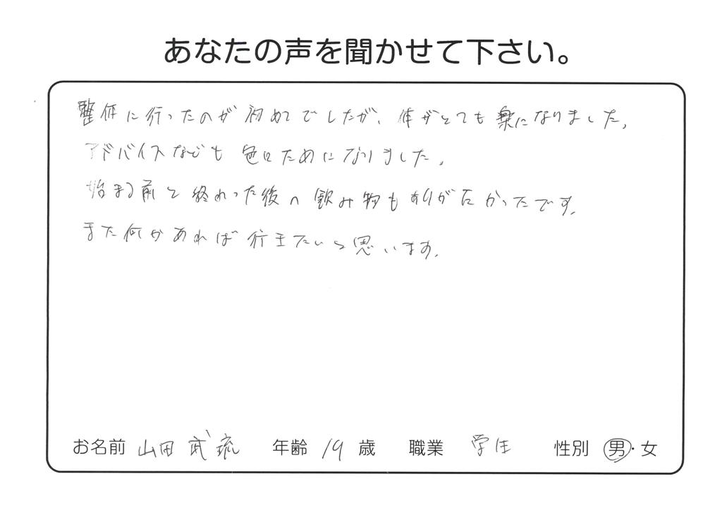 たくさんのお言葉ありがとうございます。実際に見て感じた事を言葉に表す事って簡単な事ではないですね!みなさん一生懸命に書いていただいた事が無駄にならないよう施術させていただきます。