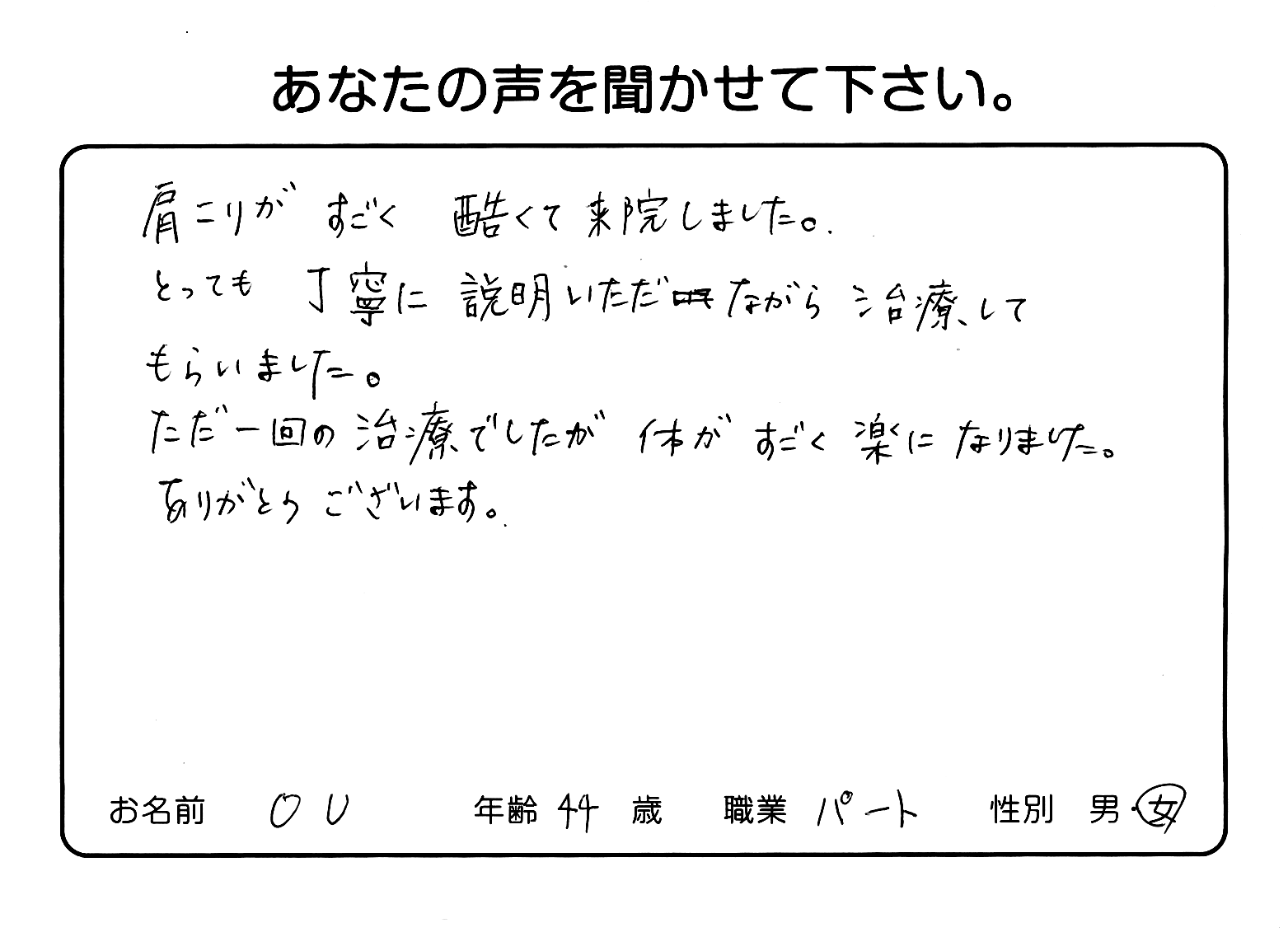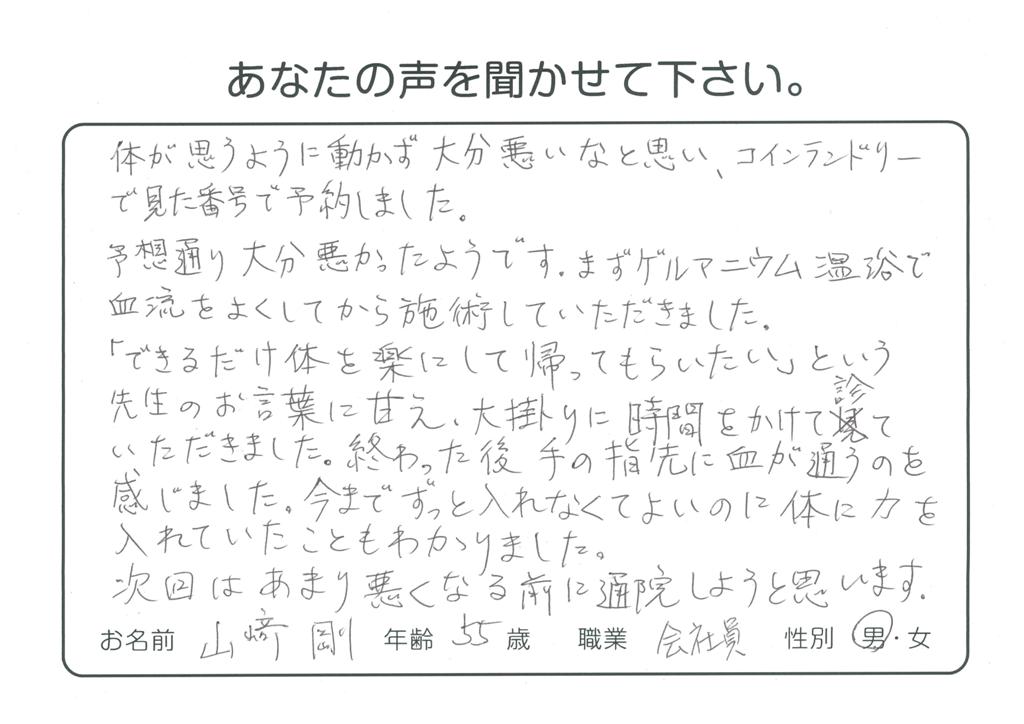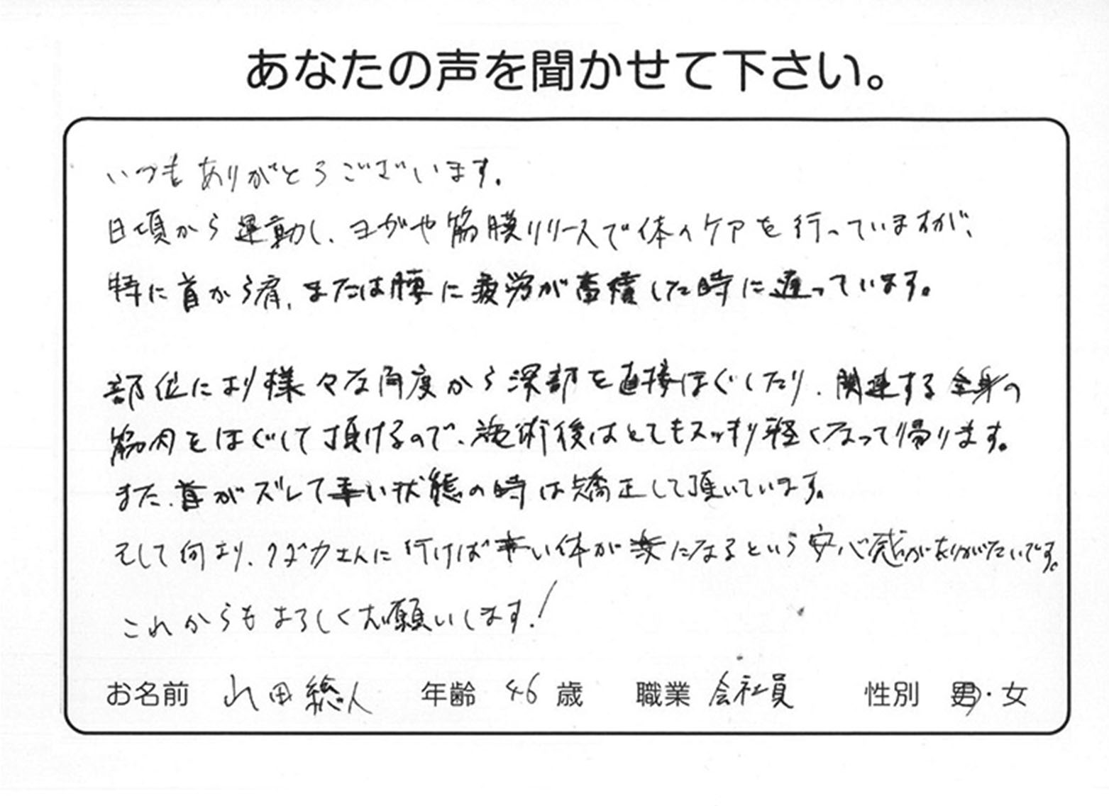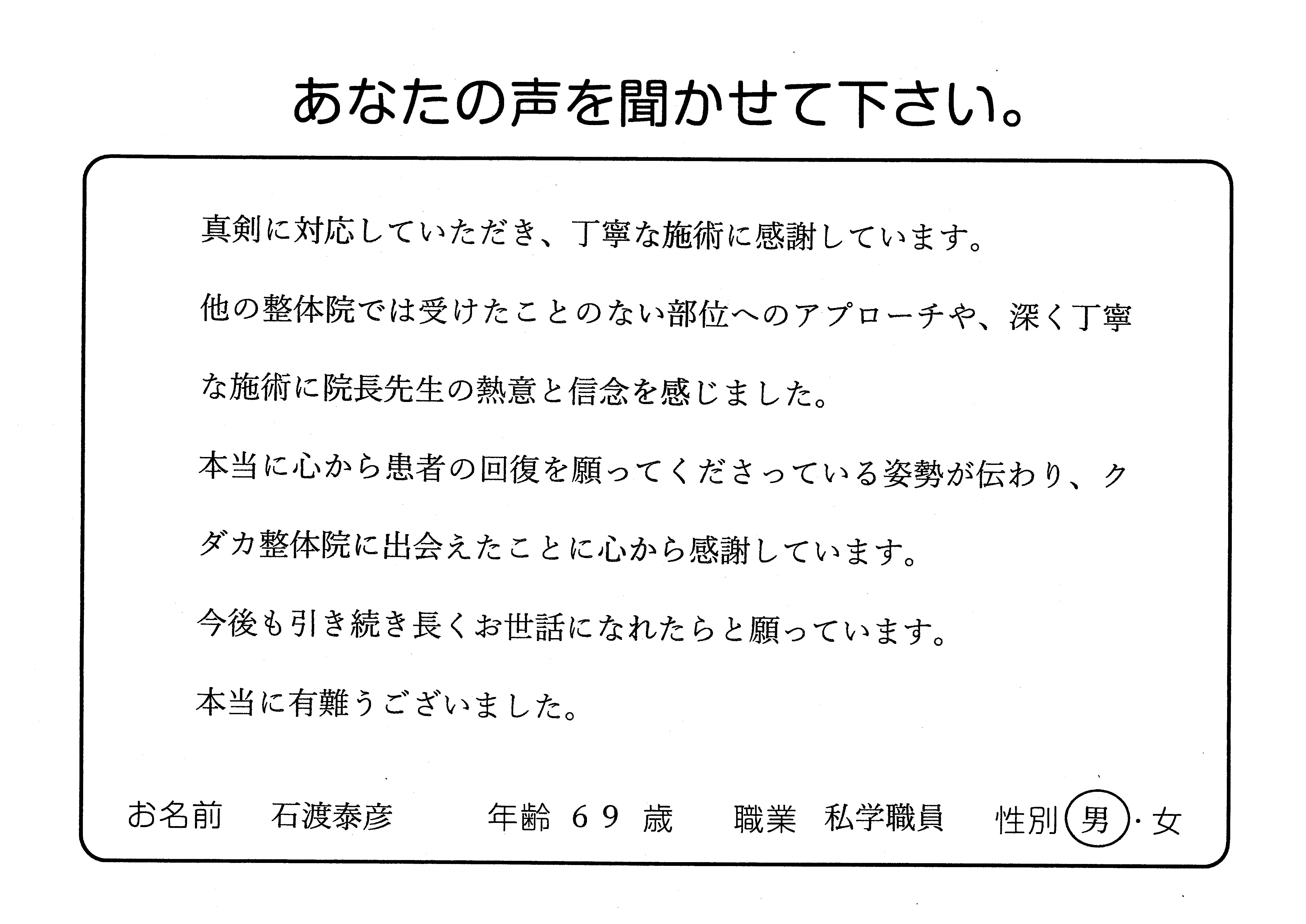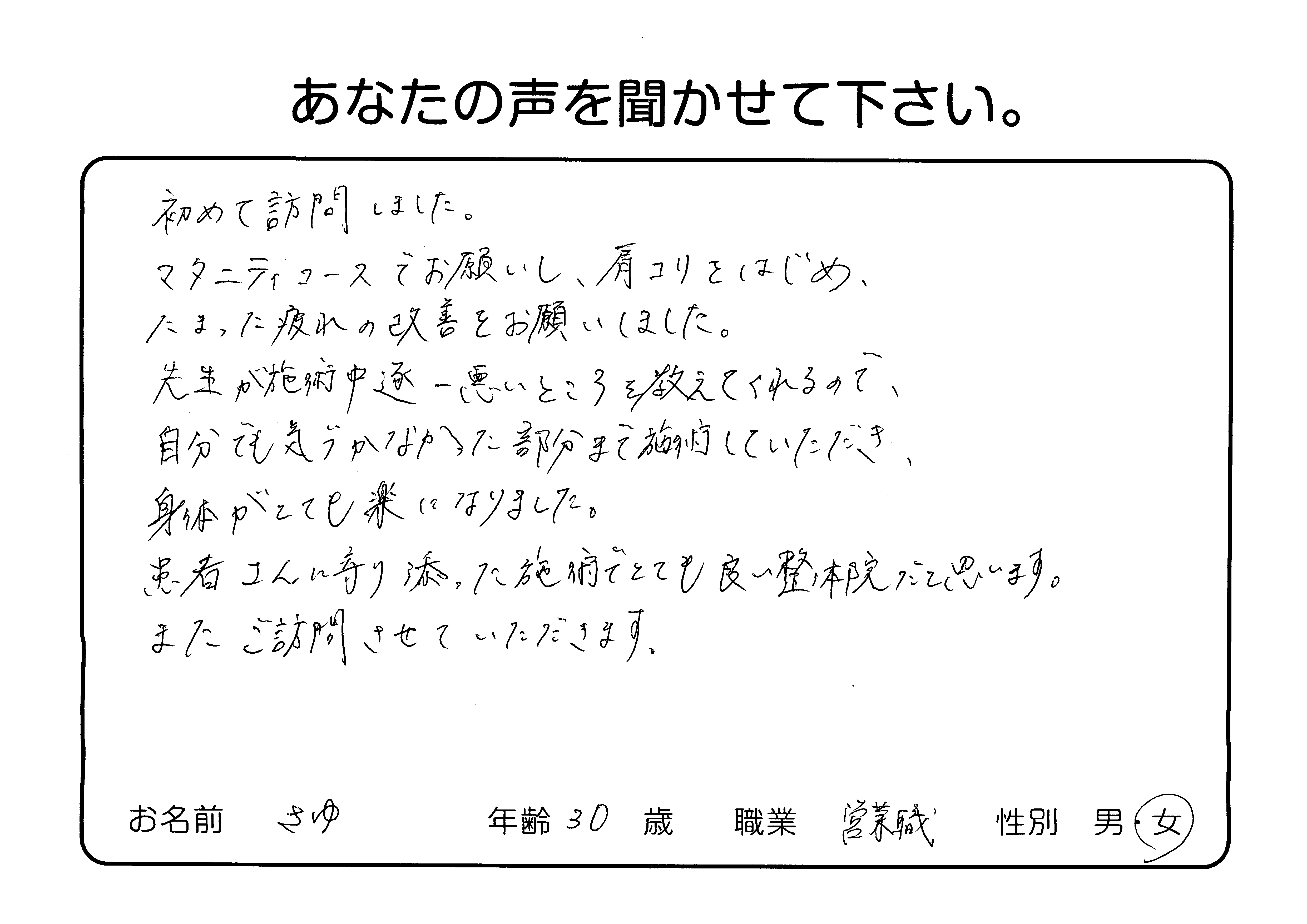 たくさんのお言葉ありがとうございます。実際に見て感じた事を言葉に表す事って簡単な事ではないですね!みなさん一生懸命に書いていただいた事が無駄にならないよう施術させていただきます。