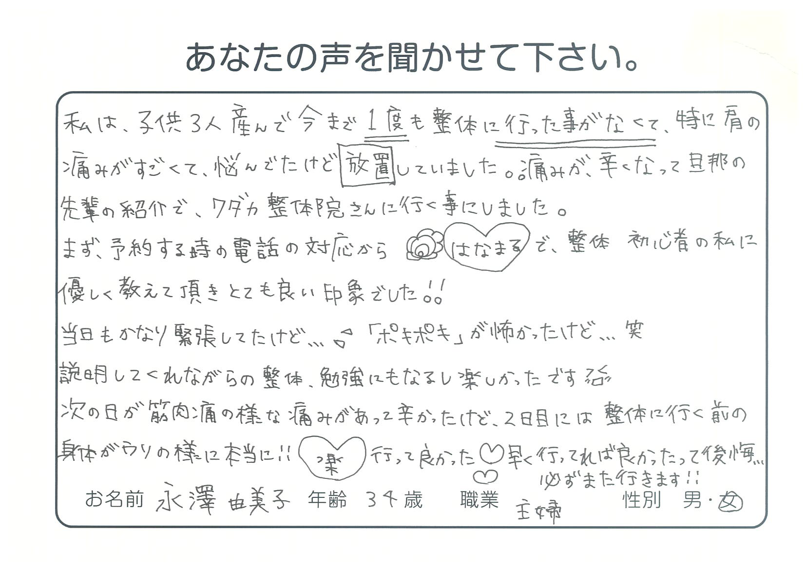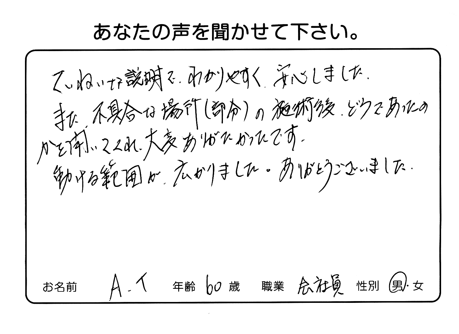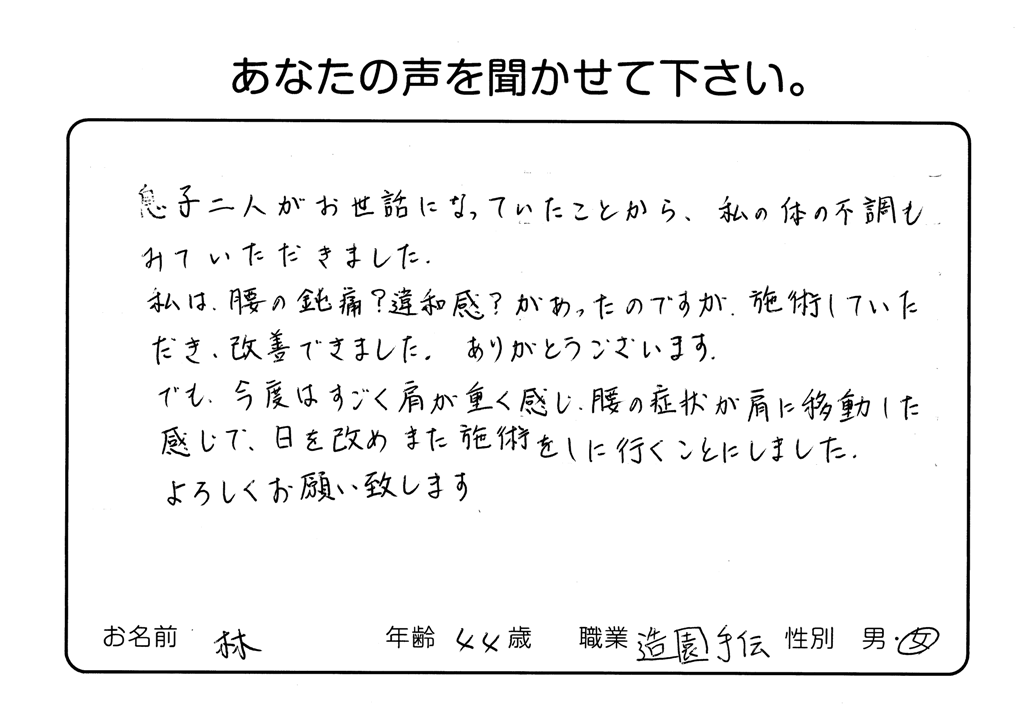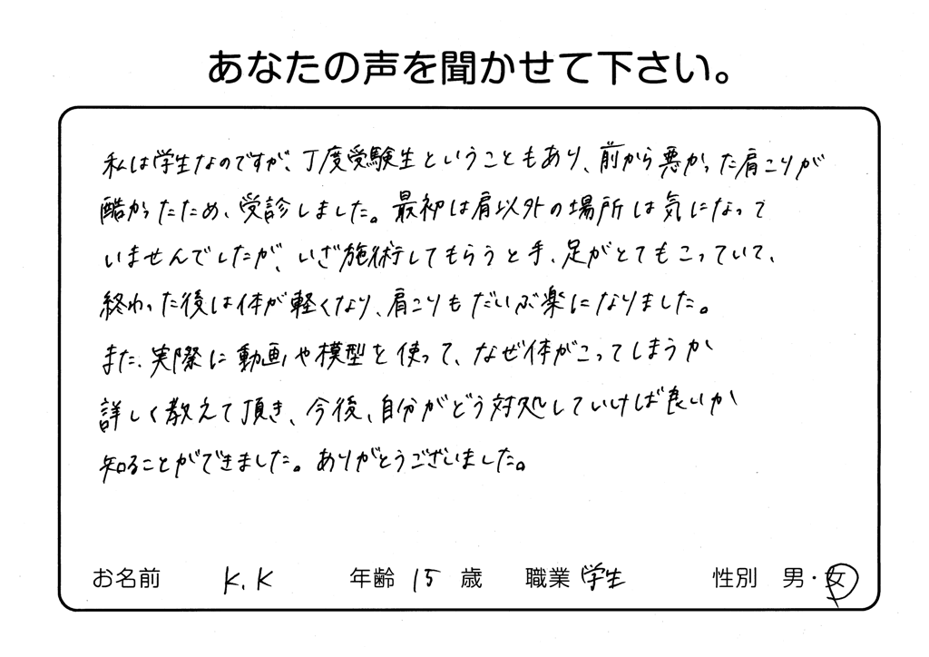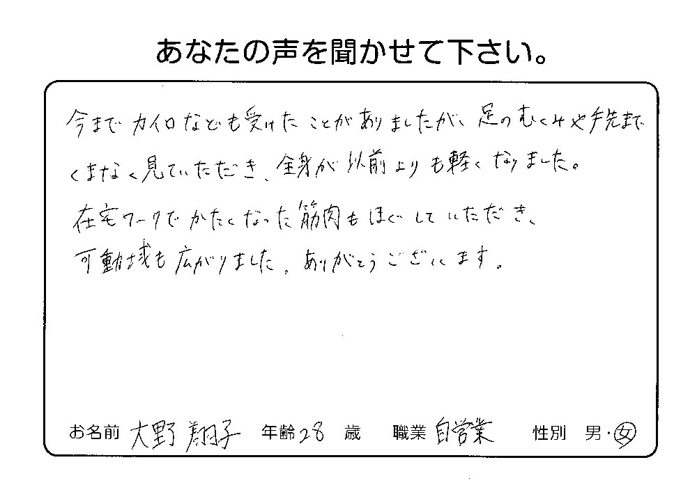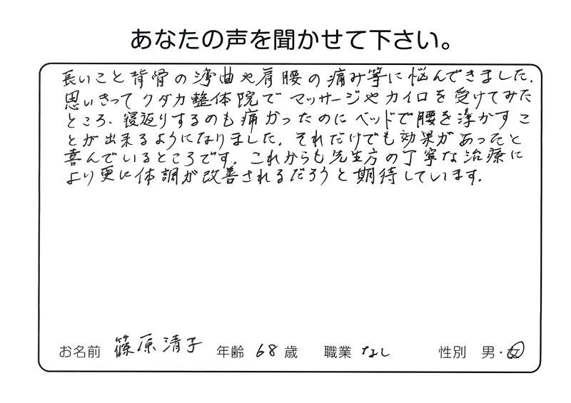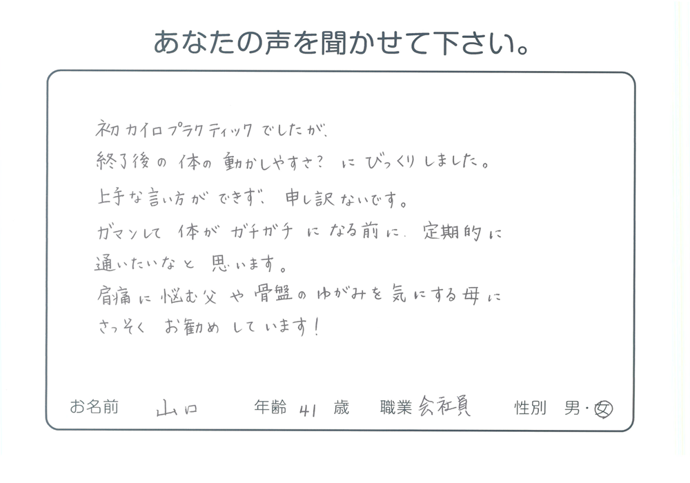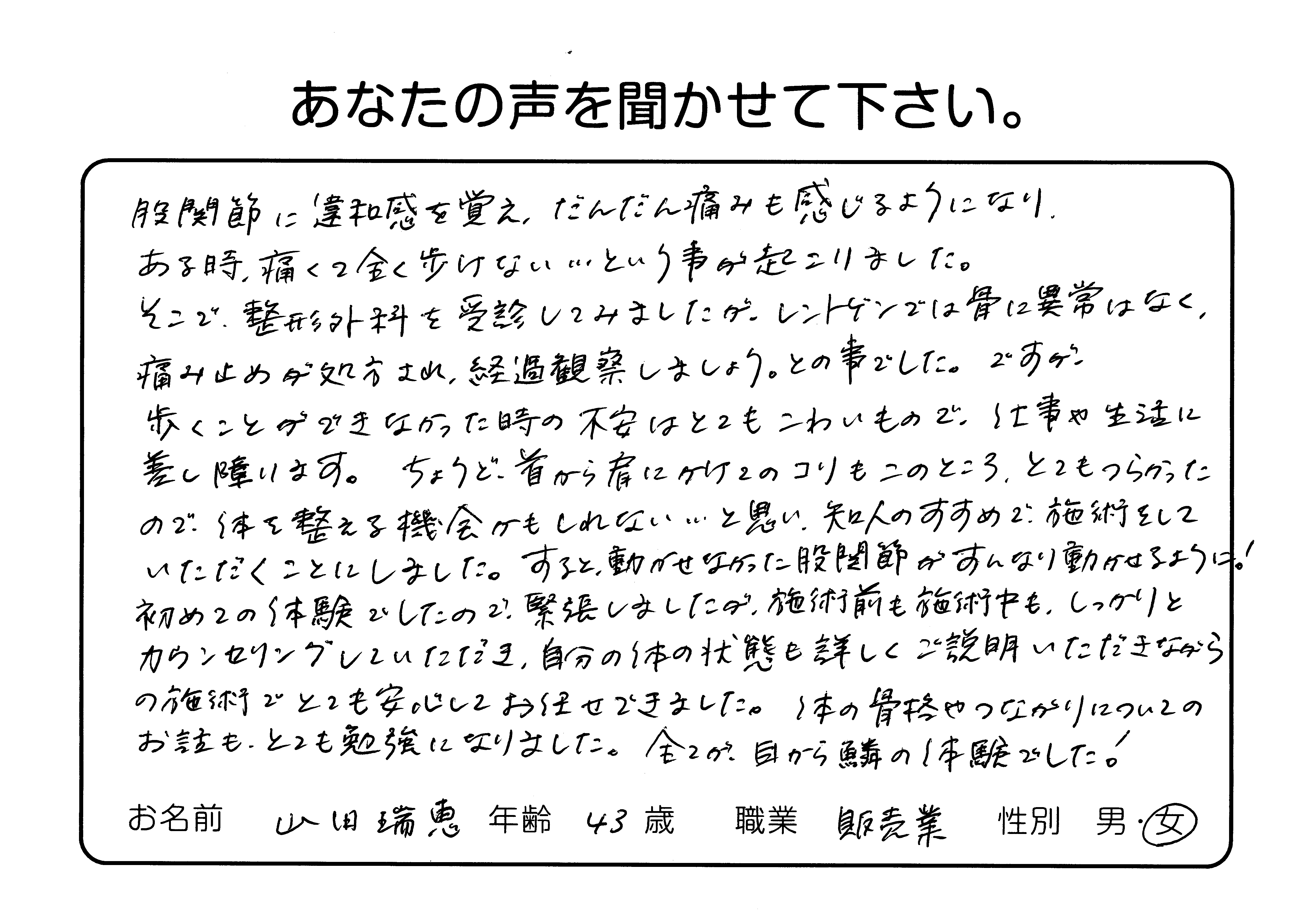 たくさんのお言葉ありがとうございます。実際に見て感じた事を言葉に表す事って簡単な事ではないですね!みなさん一生懸命に書いていただいた事が無駄にならないよう施術させていただきます。