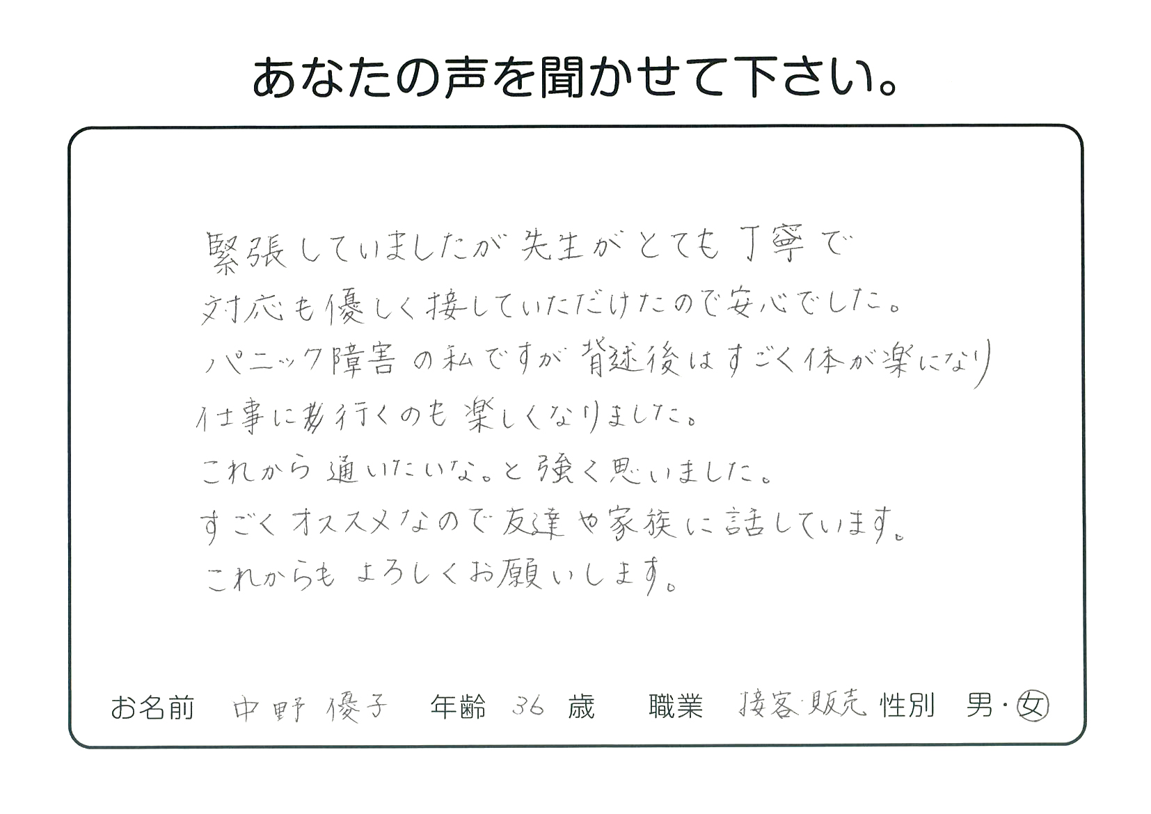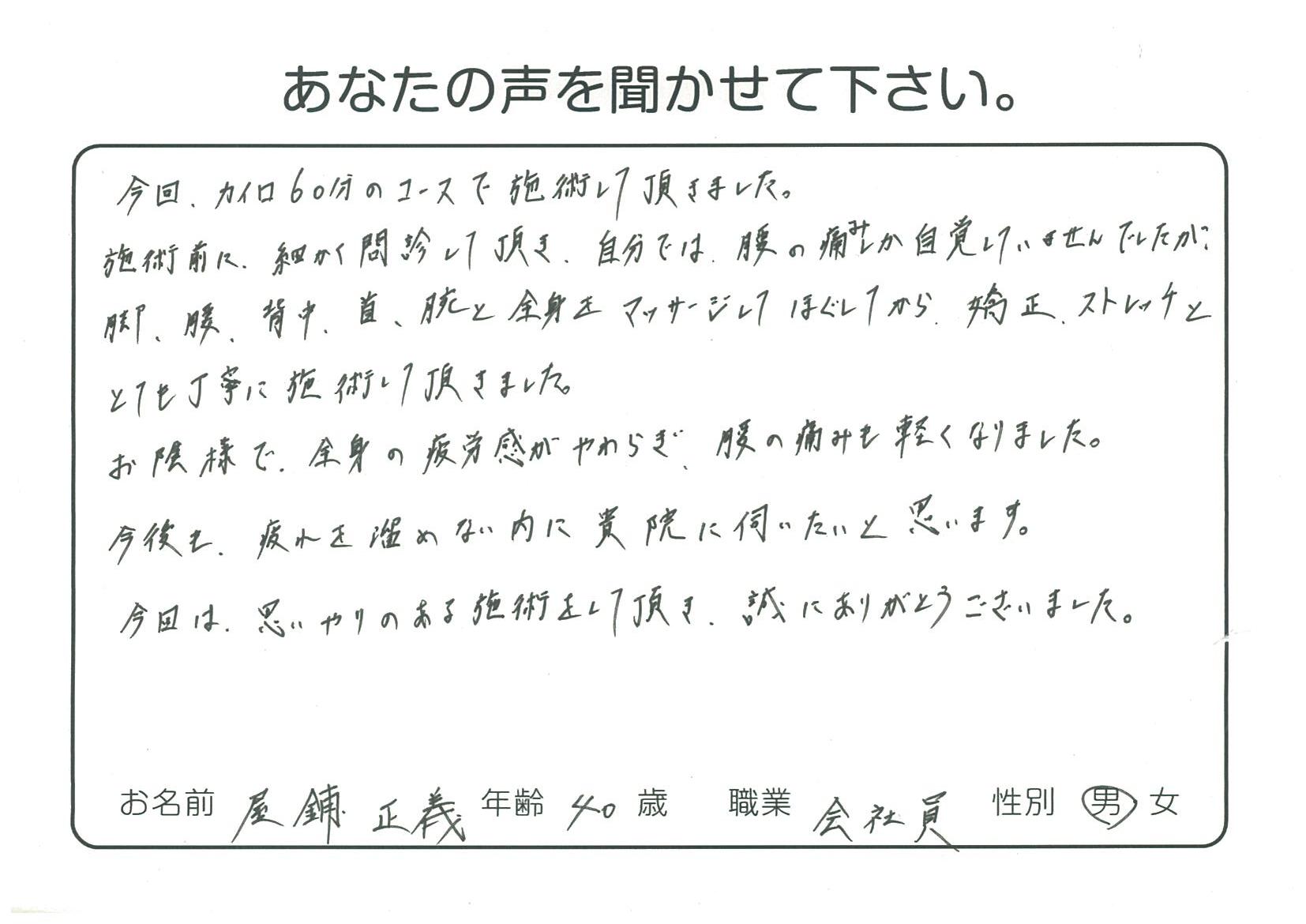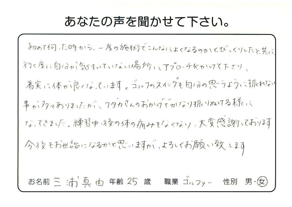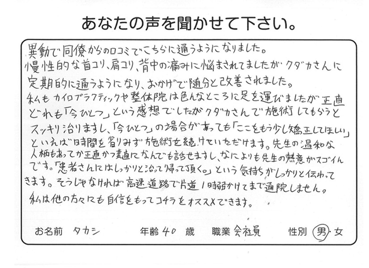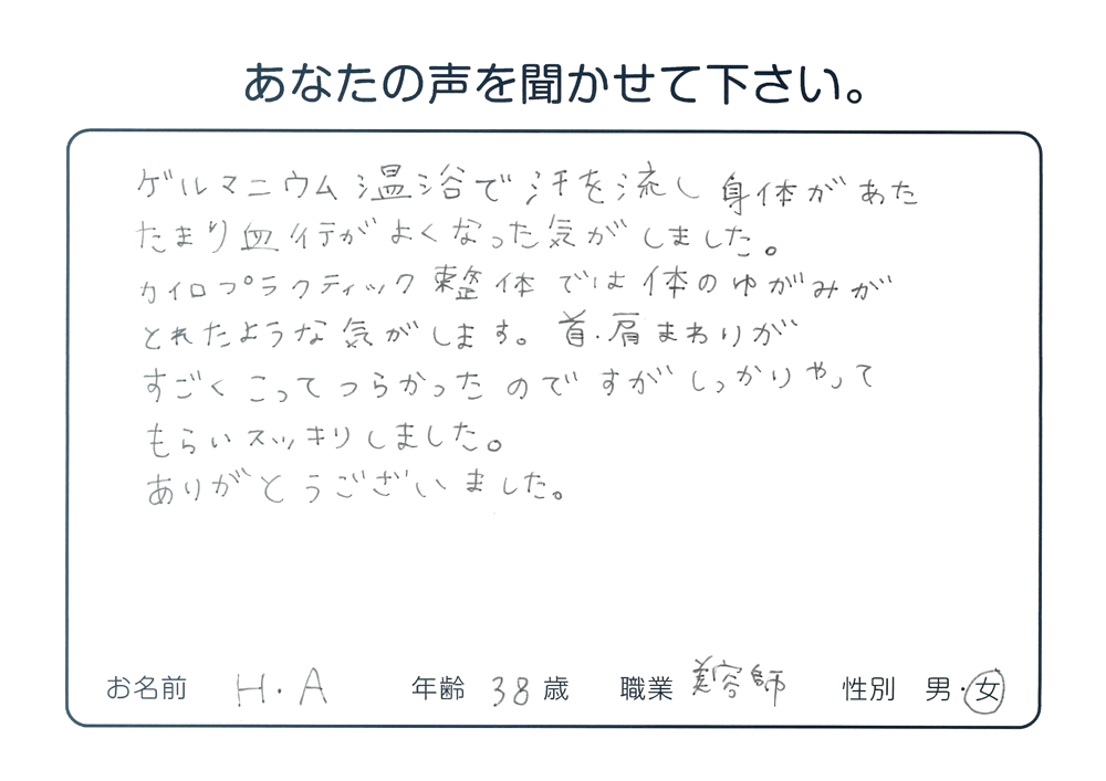 たくさんのお言葉ありがとうございます。実際に見て感じた事を言葉に表す事って簡単な事ではないですね!みなさん一生懸命に書いていただいた事が無駄にならないよう施術させていただきます。