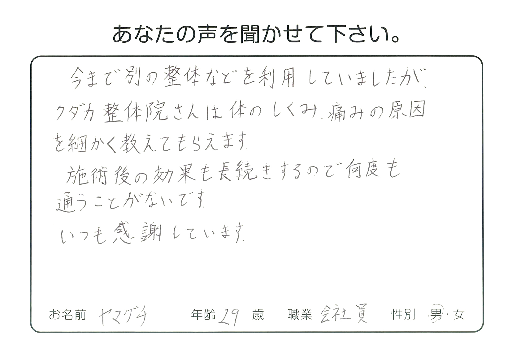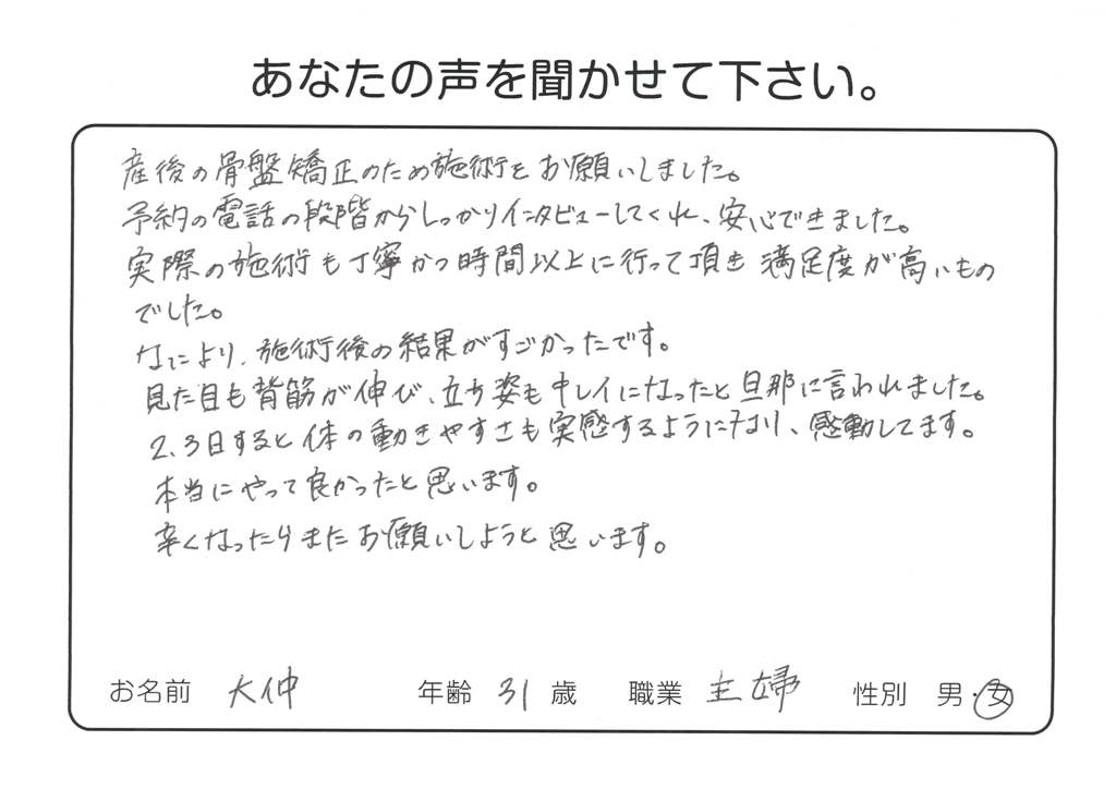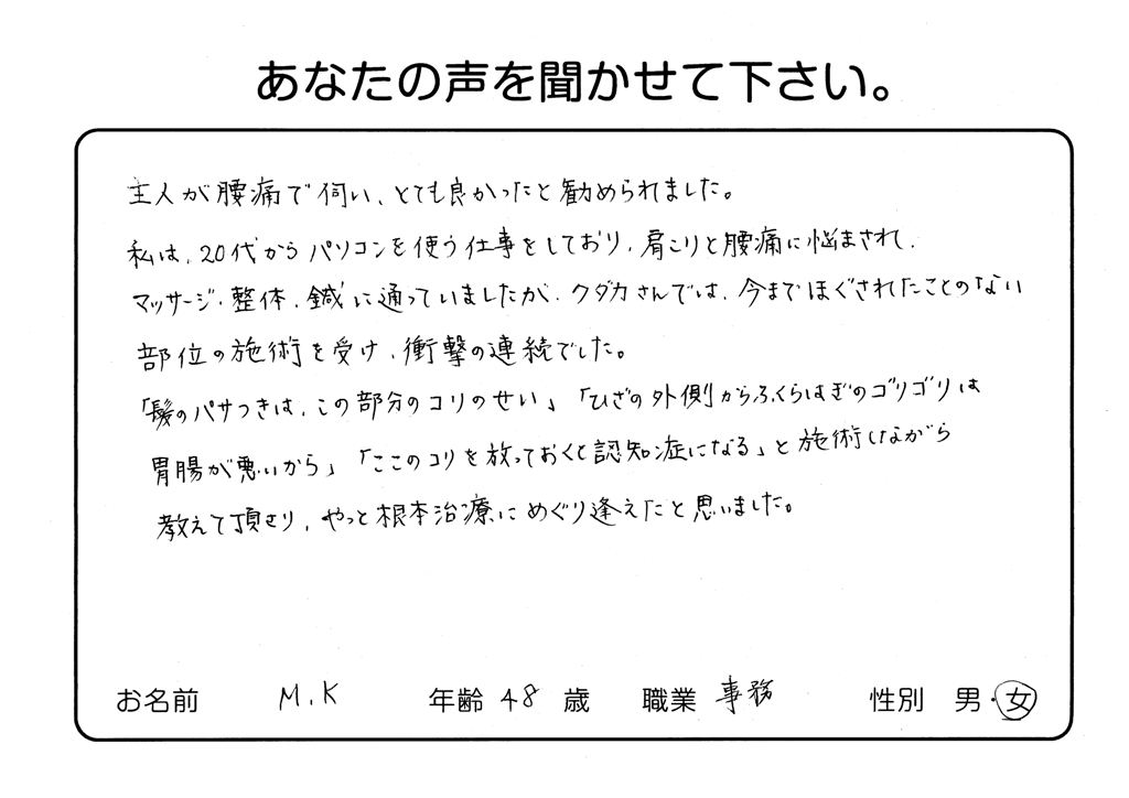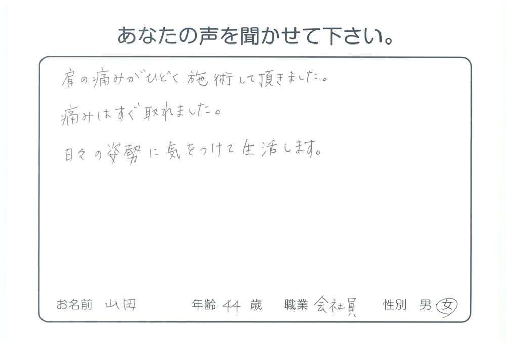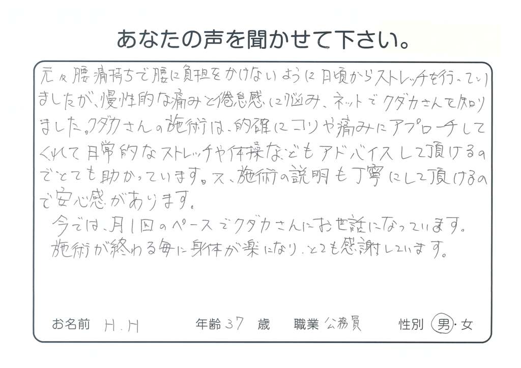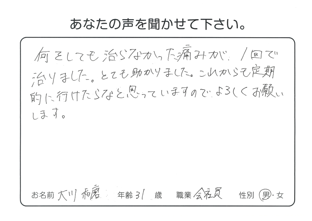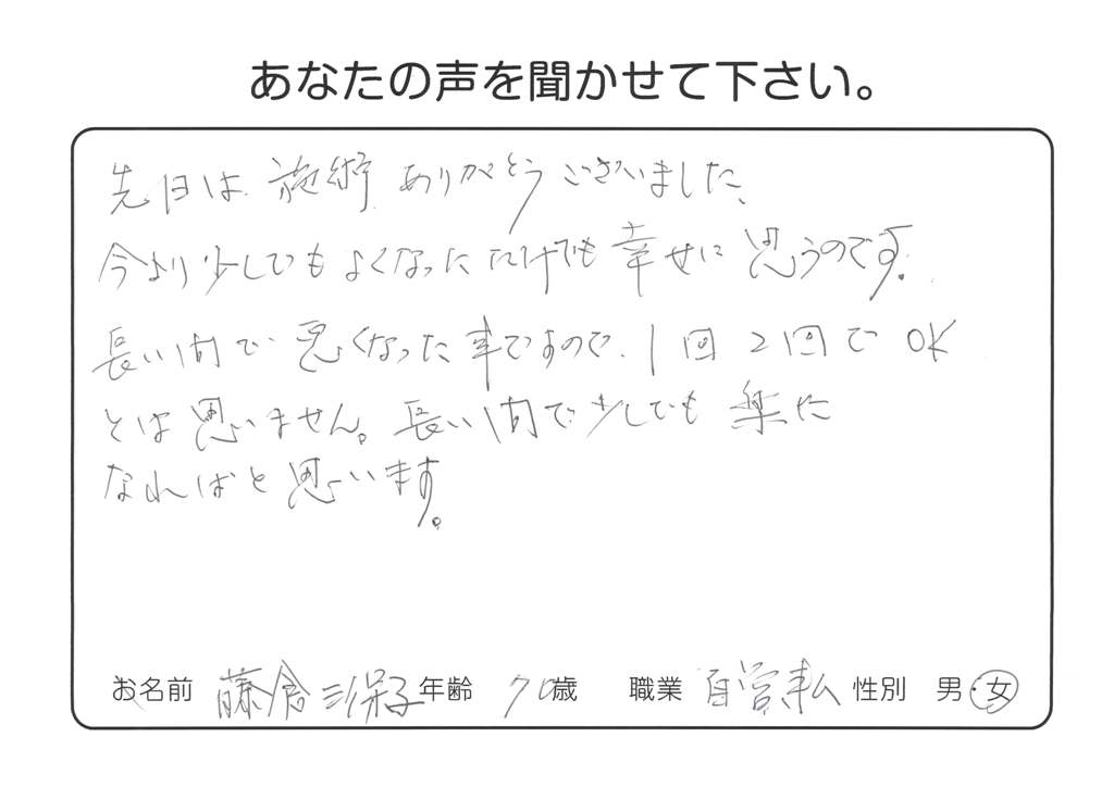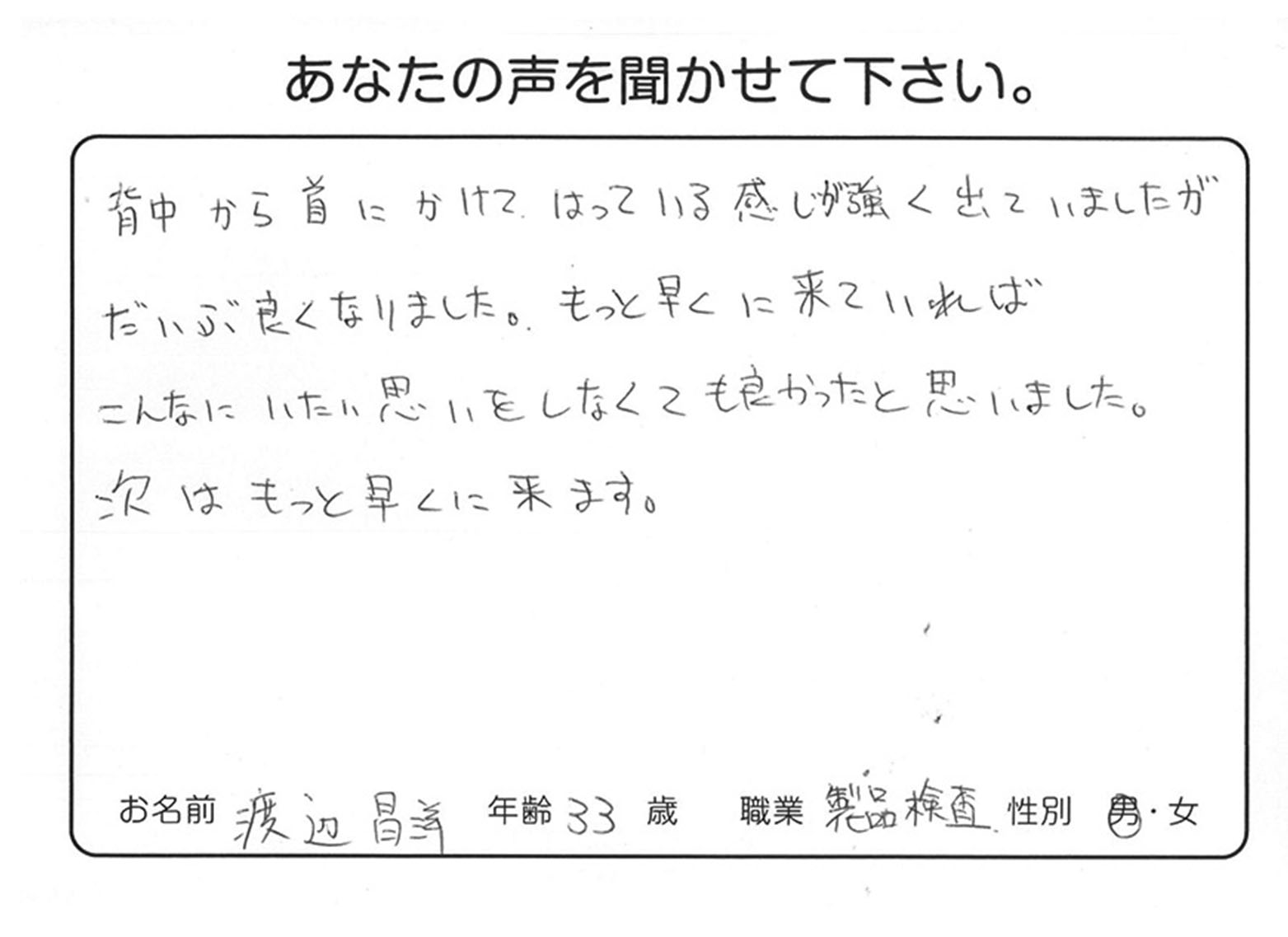 たくさんのお言葉ありがとうございます。実際に見て感じた事を言葉に表す事って簡単な事ではないですね!みなさん一生懸命に書いていただいた事が無駄にならないよう施術させていただきます。