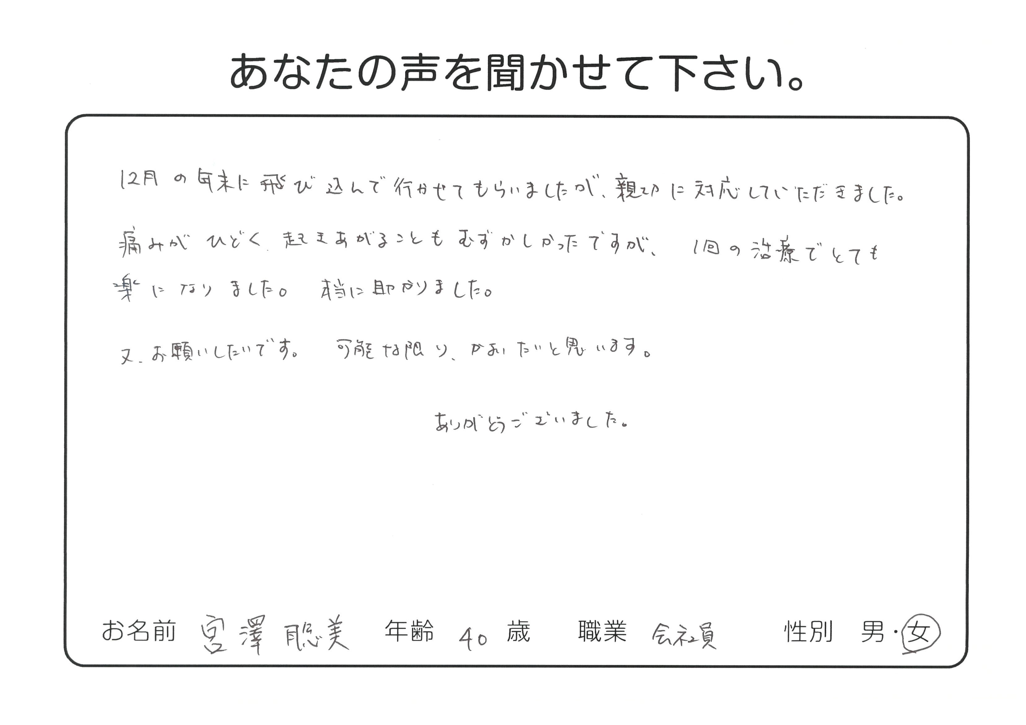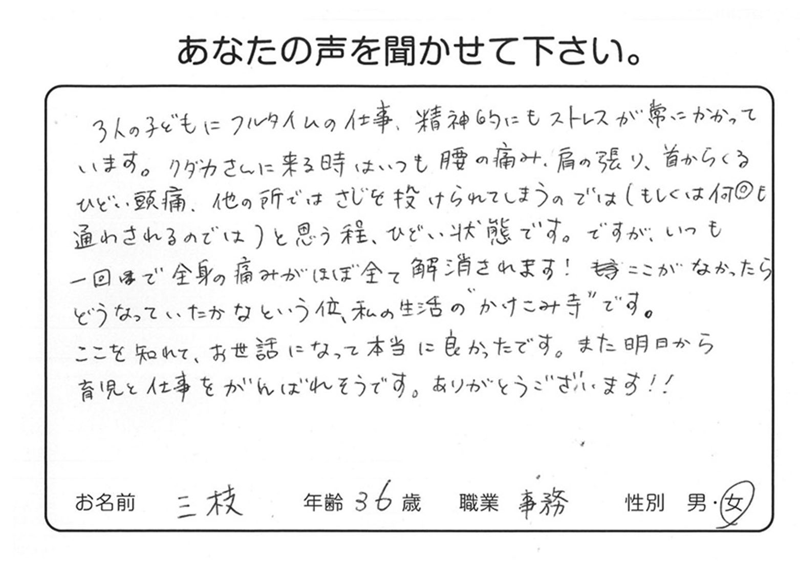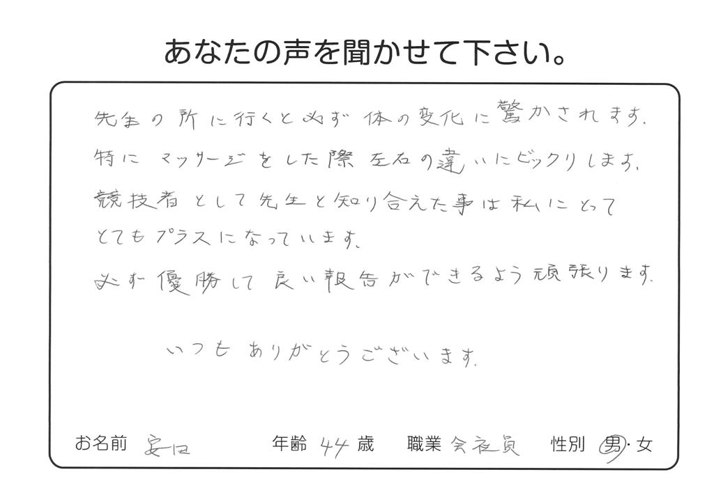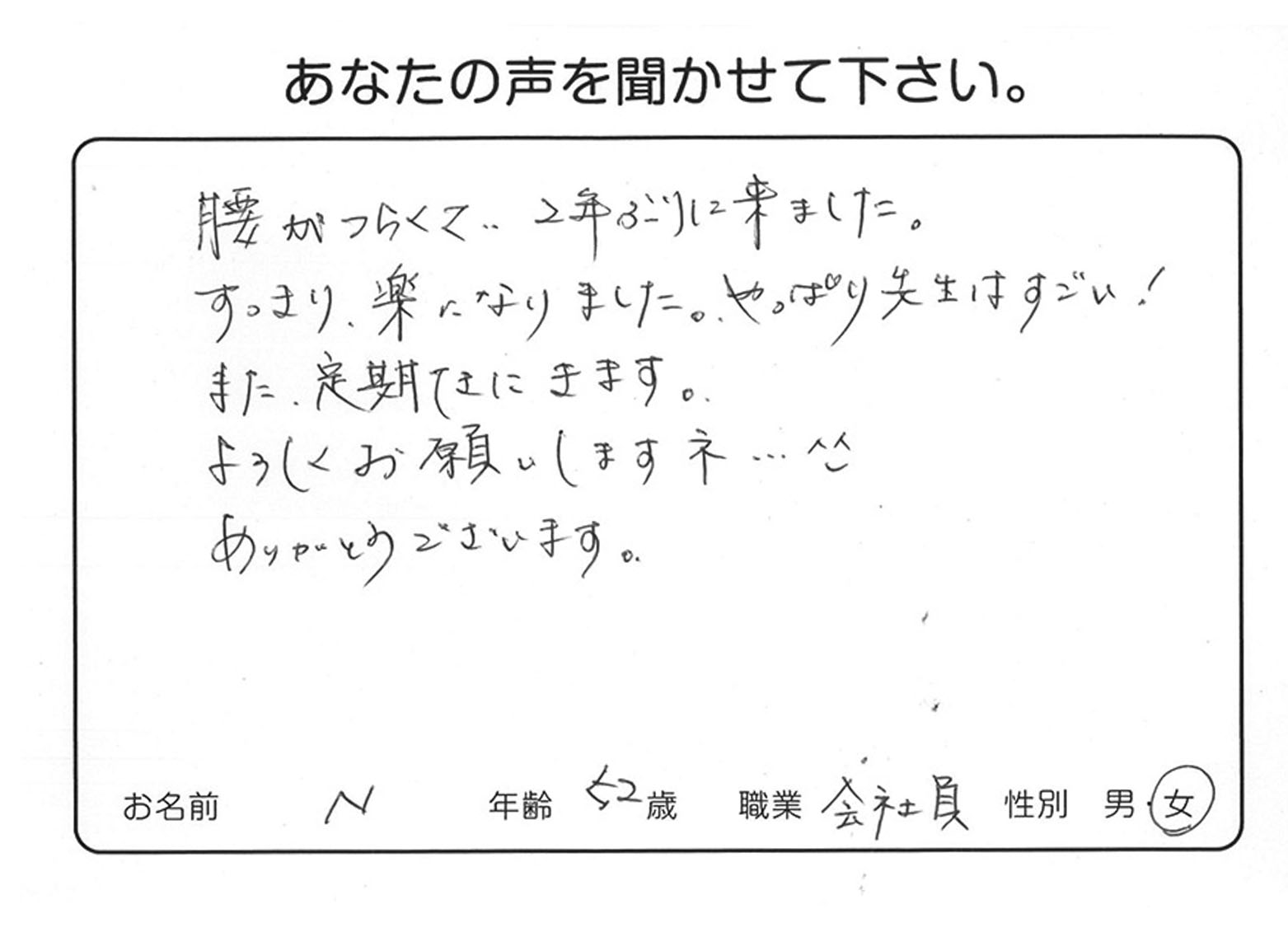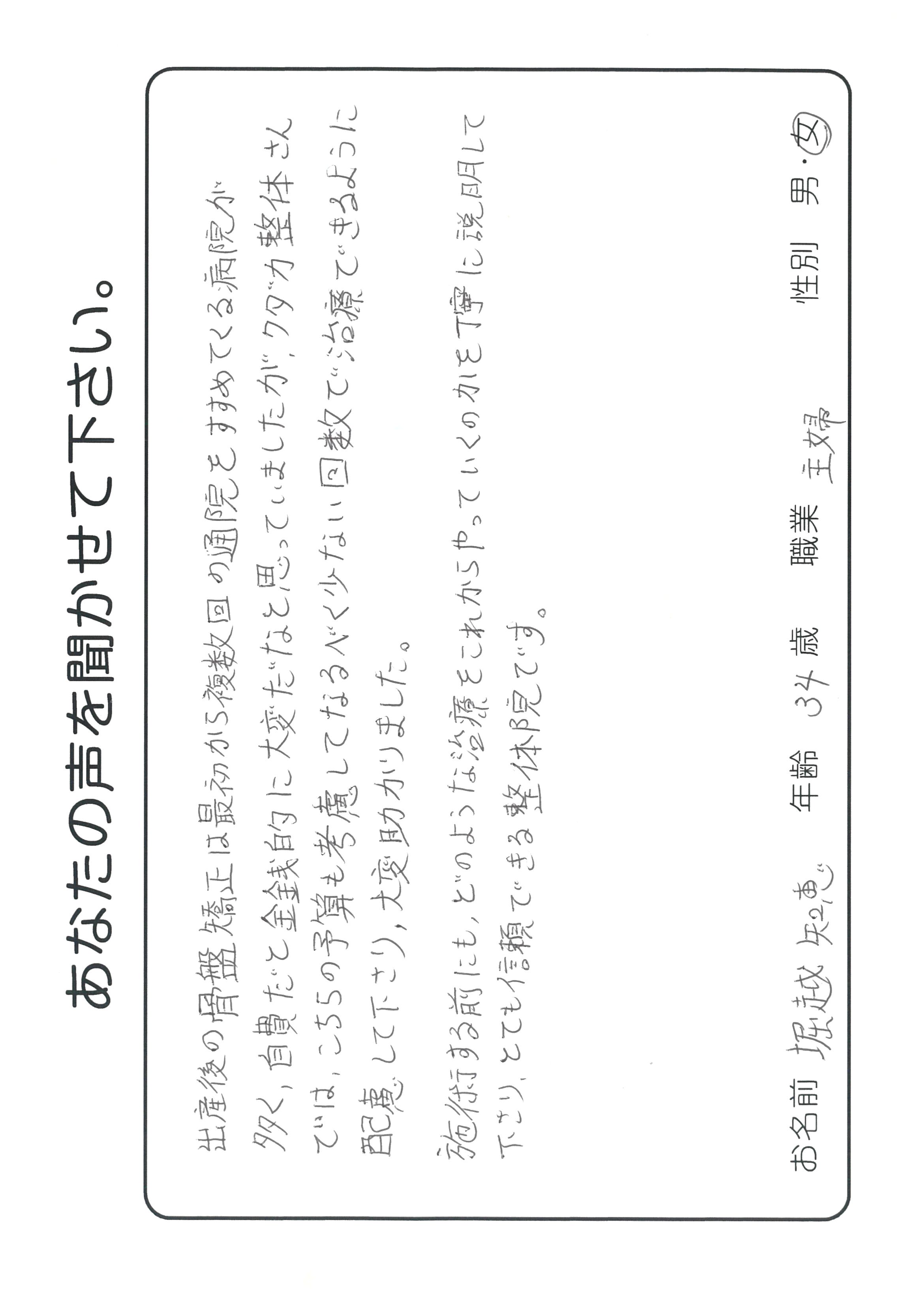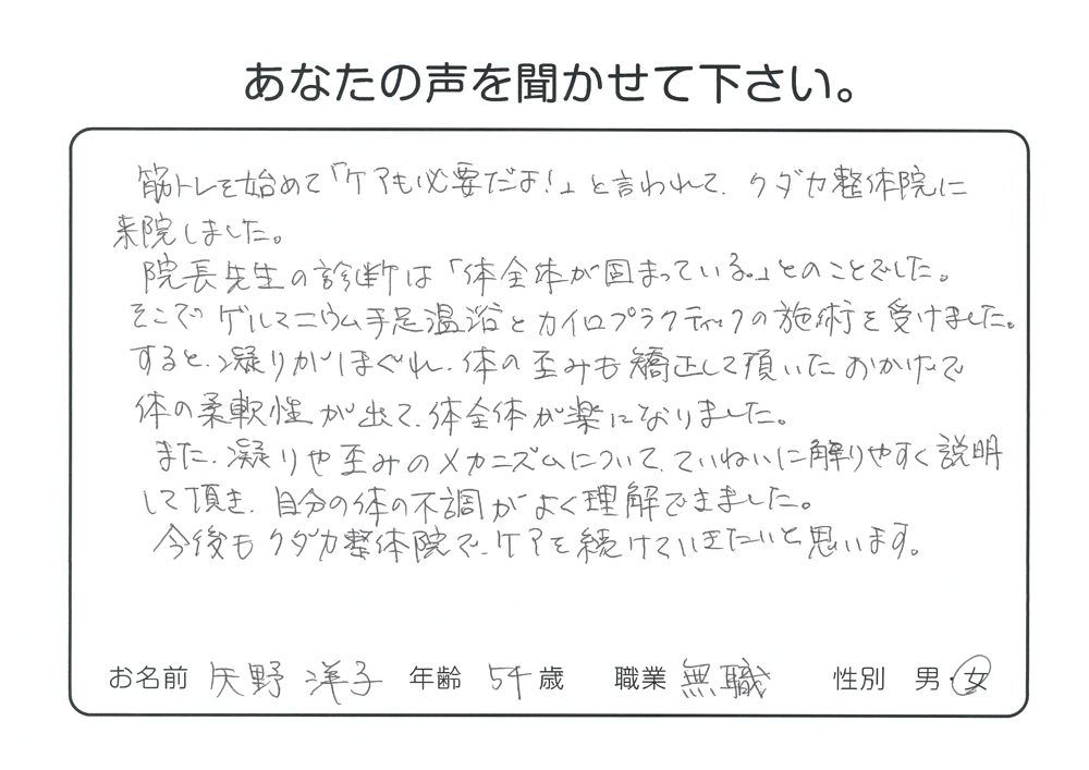 たくさんのお言葉ありがとうございます。実際に見て感じた事を言葉に表す事って簡単な事ではないですね!みなさん一生懸命に書いていただいた事が無駄にならないよう施術させていただきます。