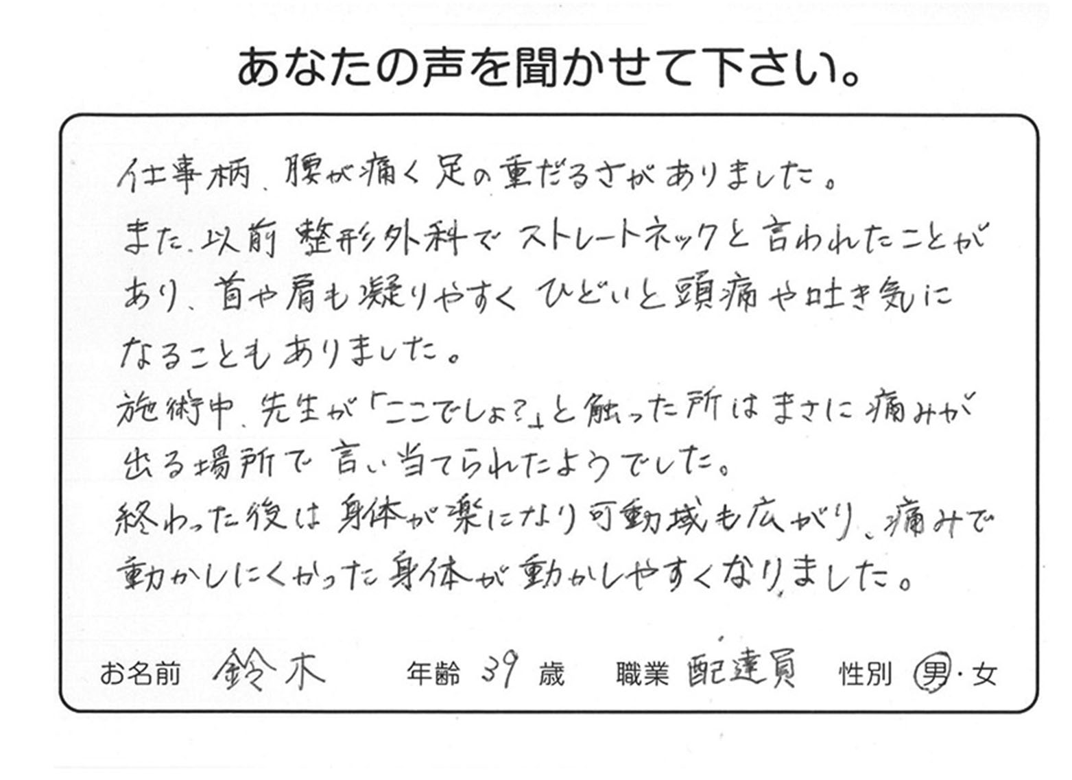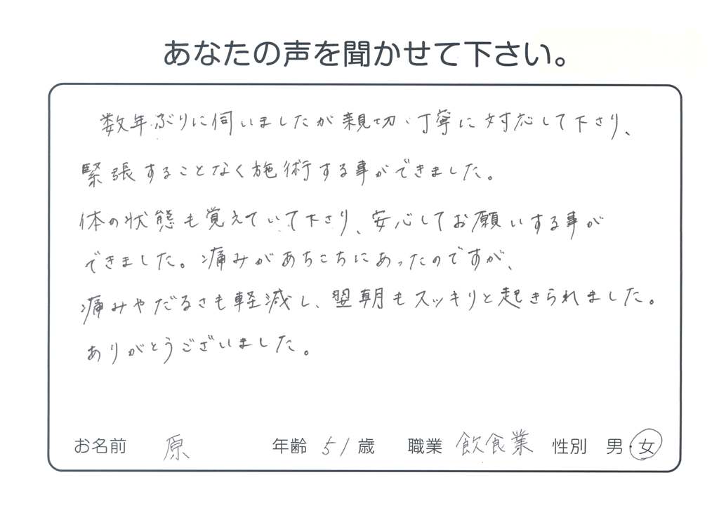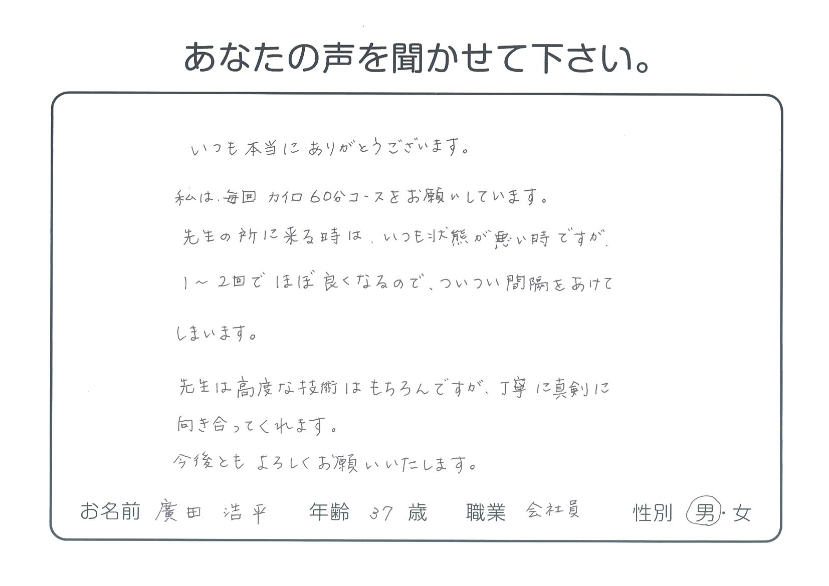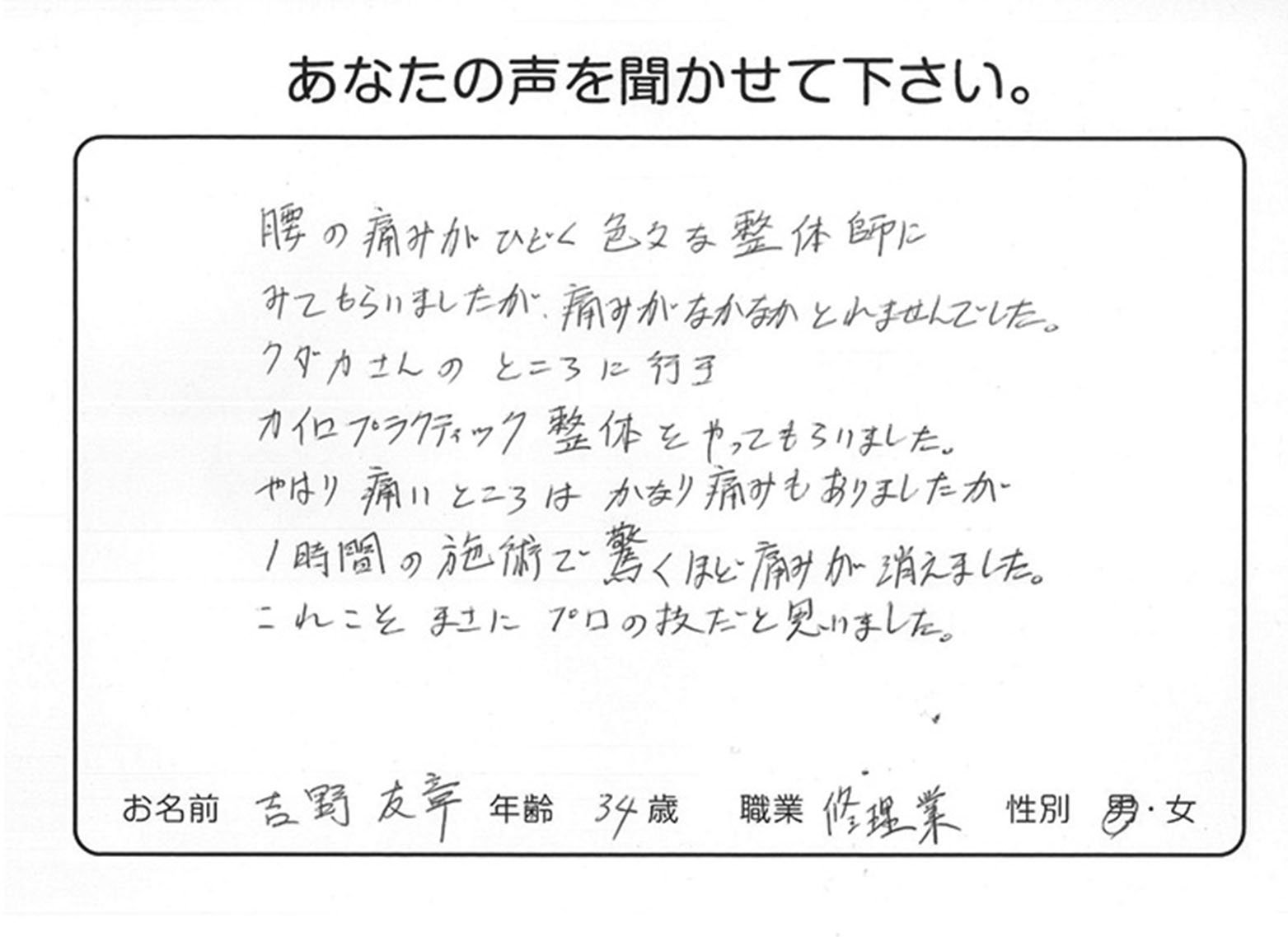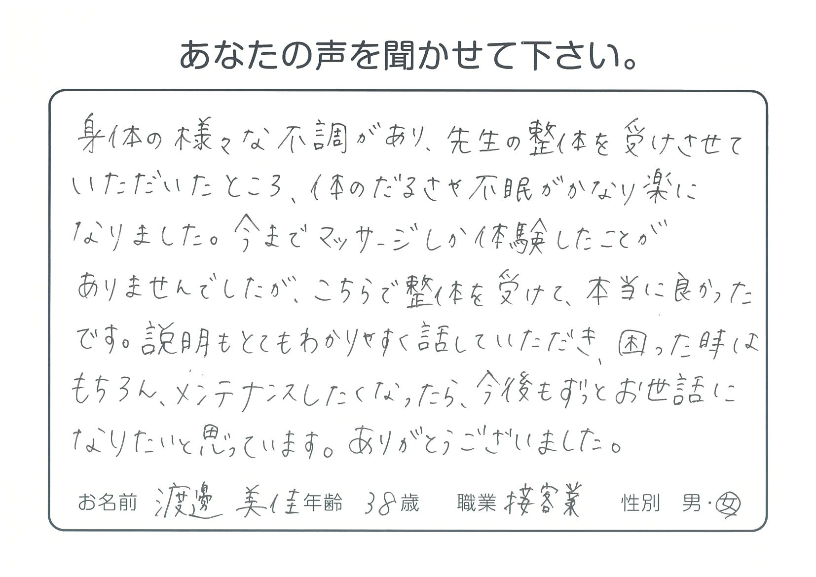 たくさんのお言葉ありがとうございます。実際に見て感じた事を言葉に表す事って簡単な事ではないですね!みなさん一生懸命に書いていただいた事が無駄にならないよう施術させていただきます。