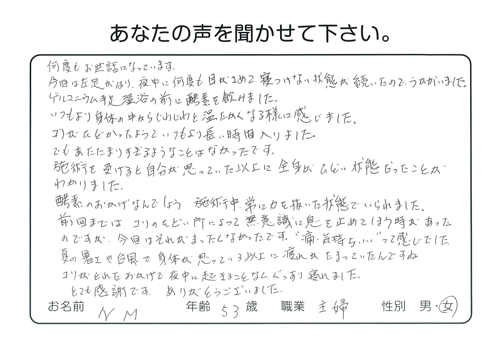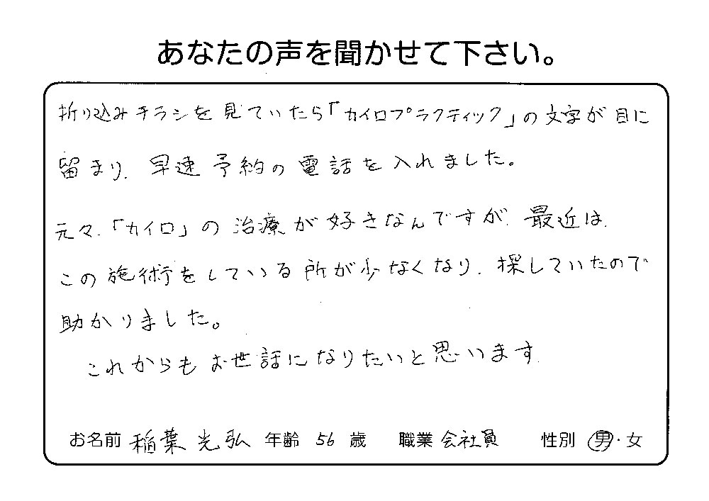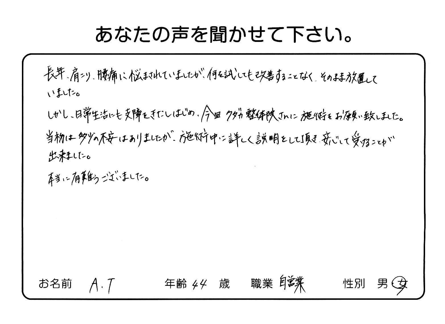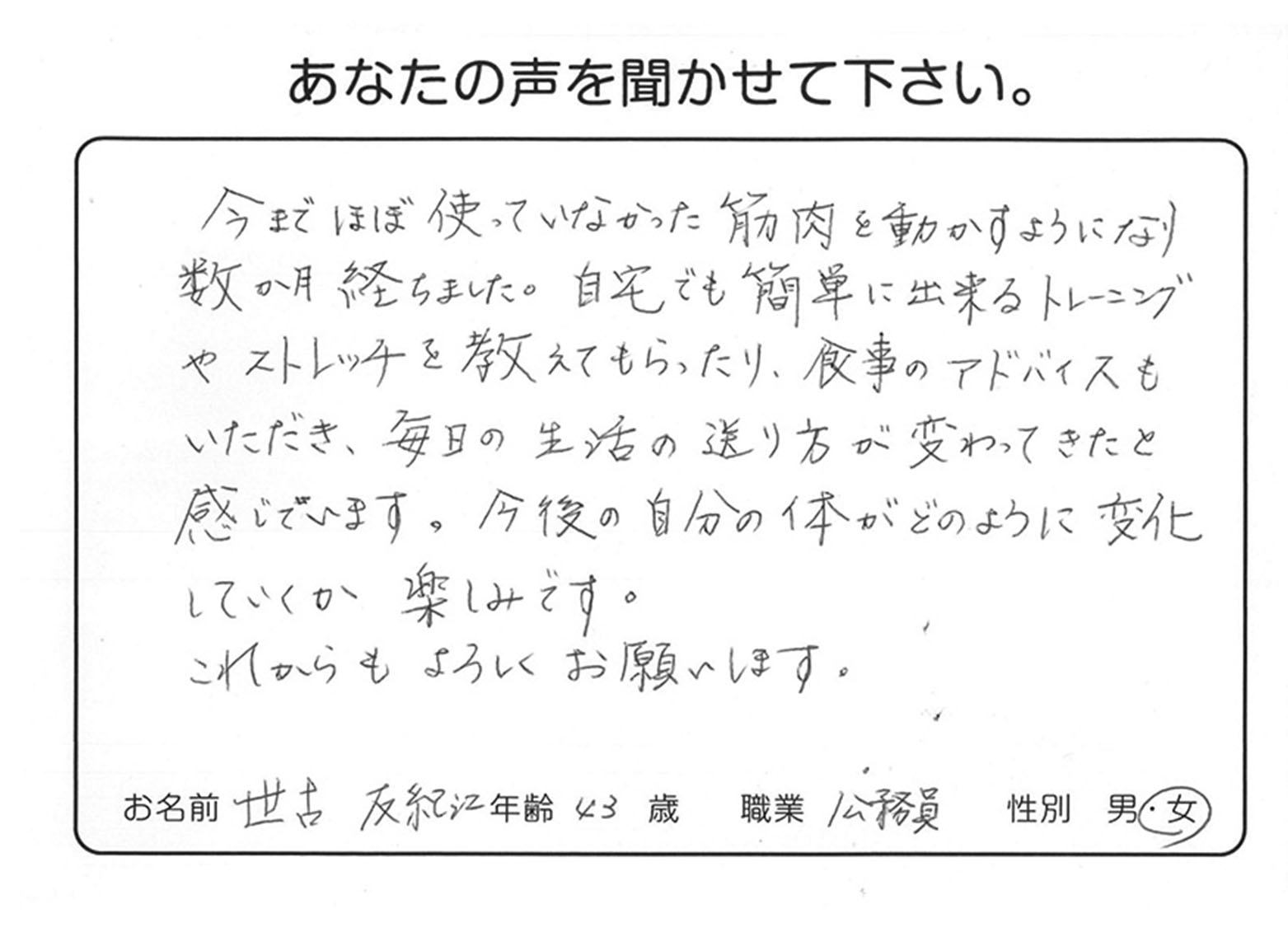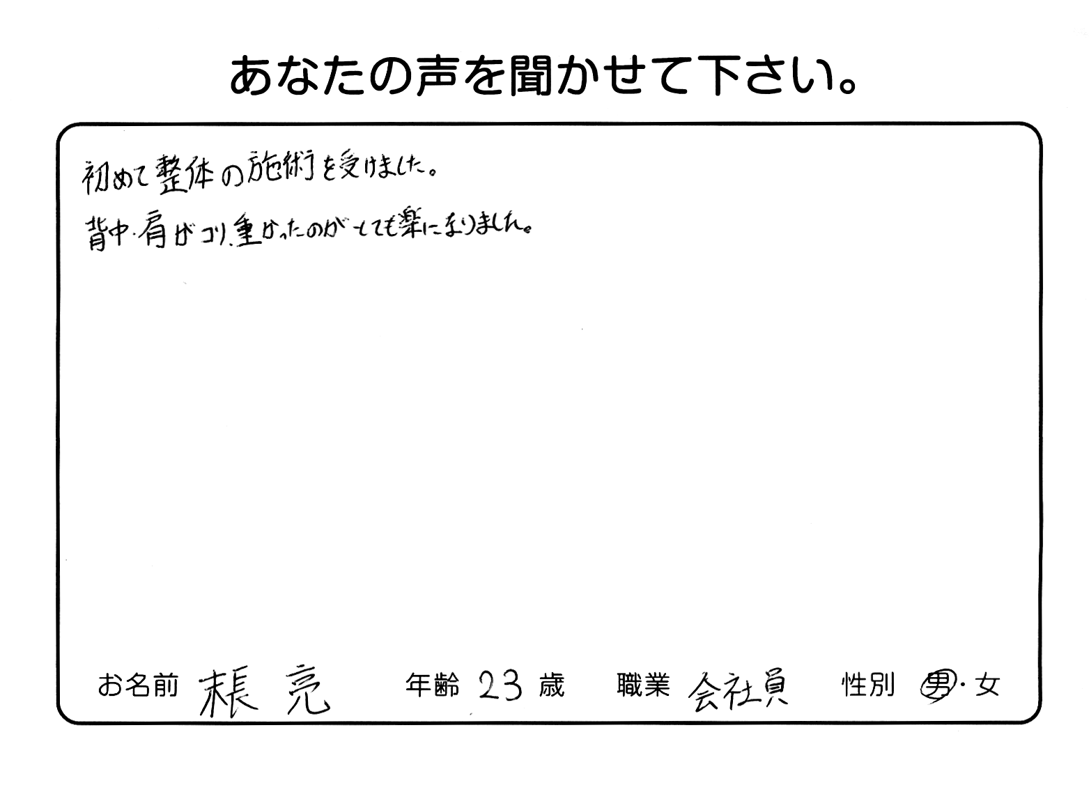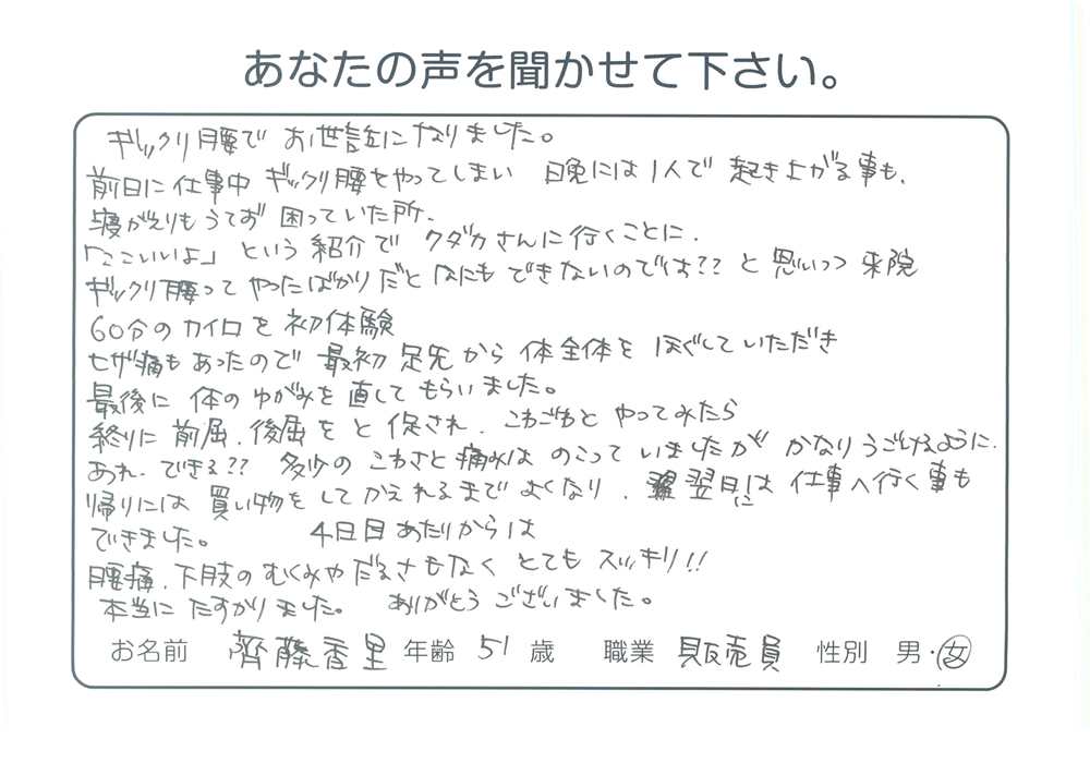 たくさんのお言葉ありがとうございます。実際に見て感じた事を言葉に表す事って簡単な事ではないですね!みなさん一生懸命に書いていただいた事が無駄にならないよう施術させていただきます。