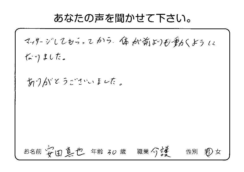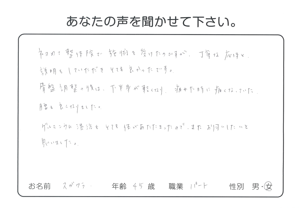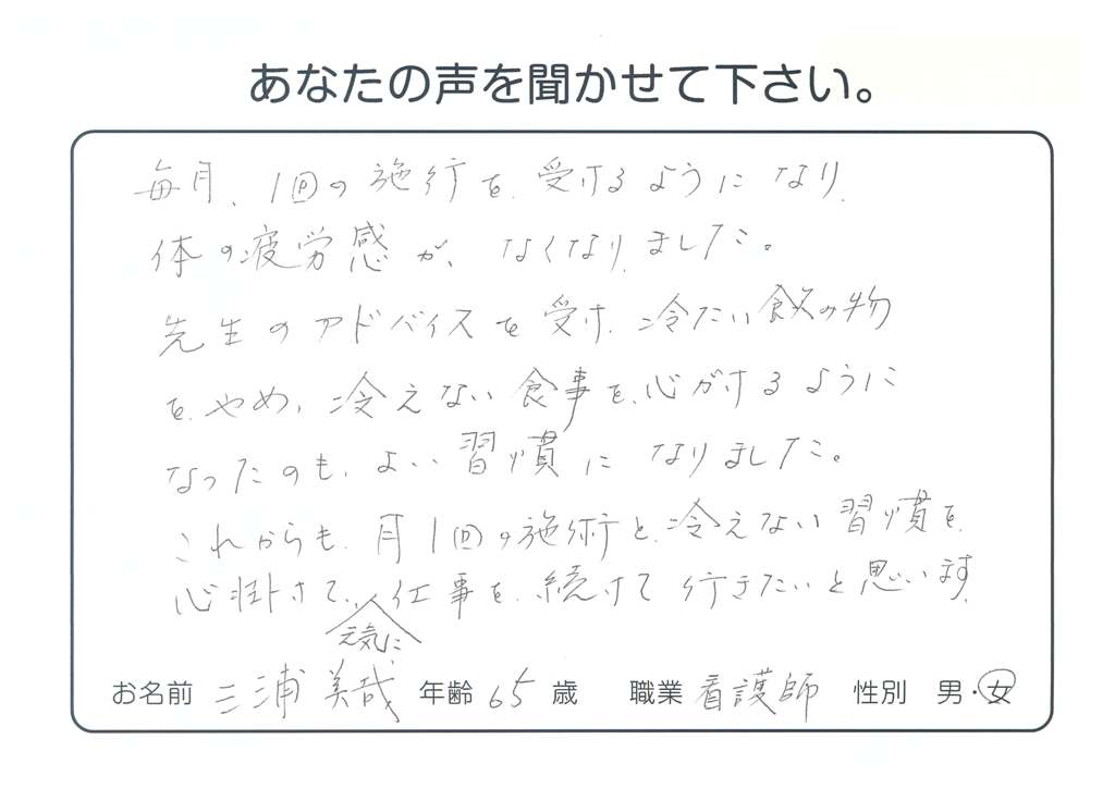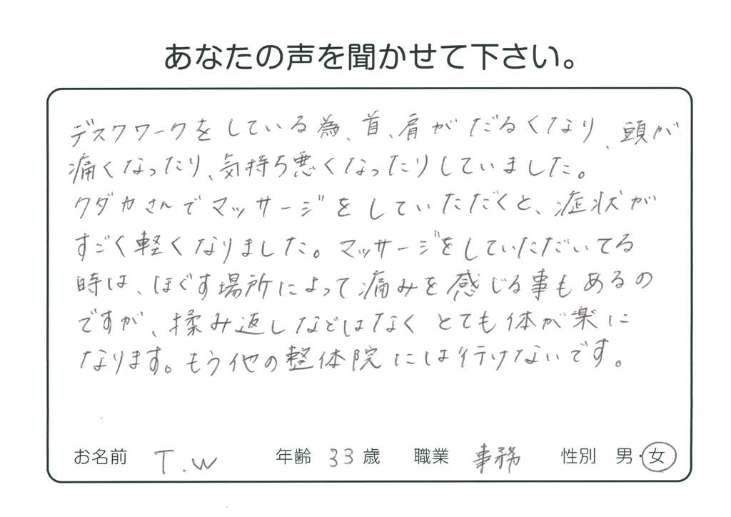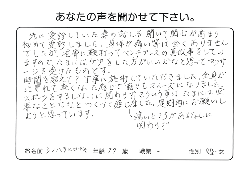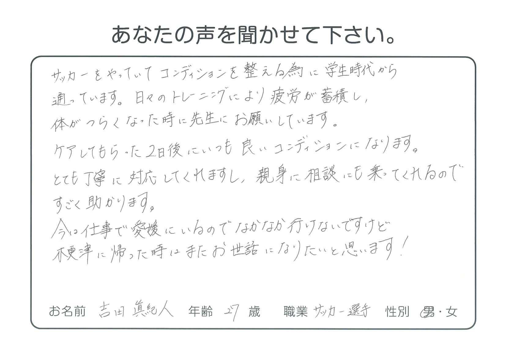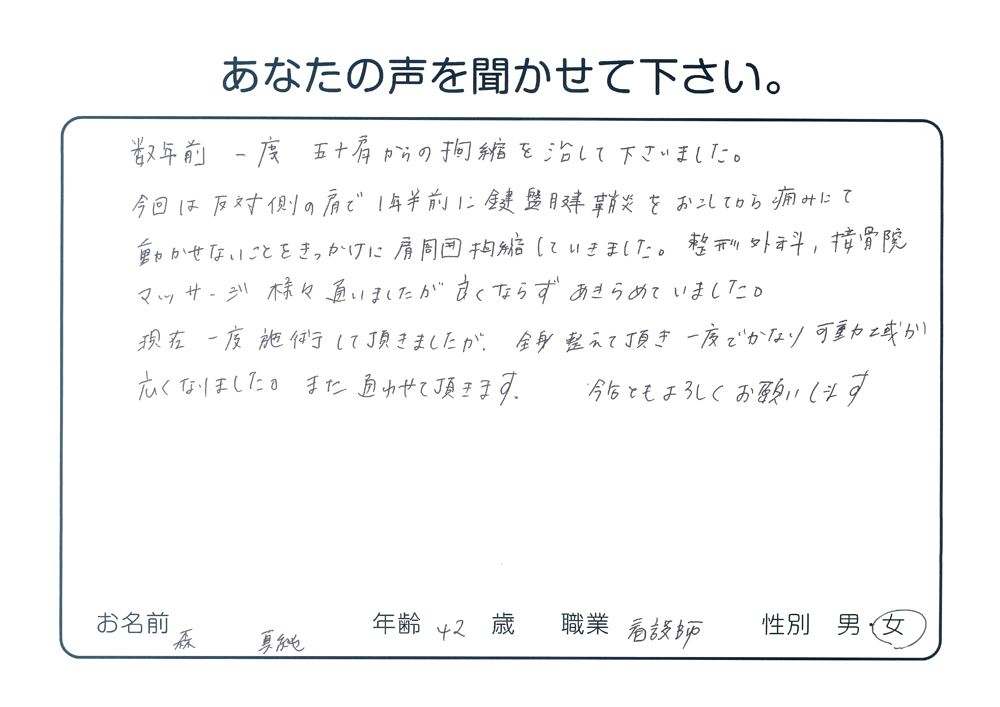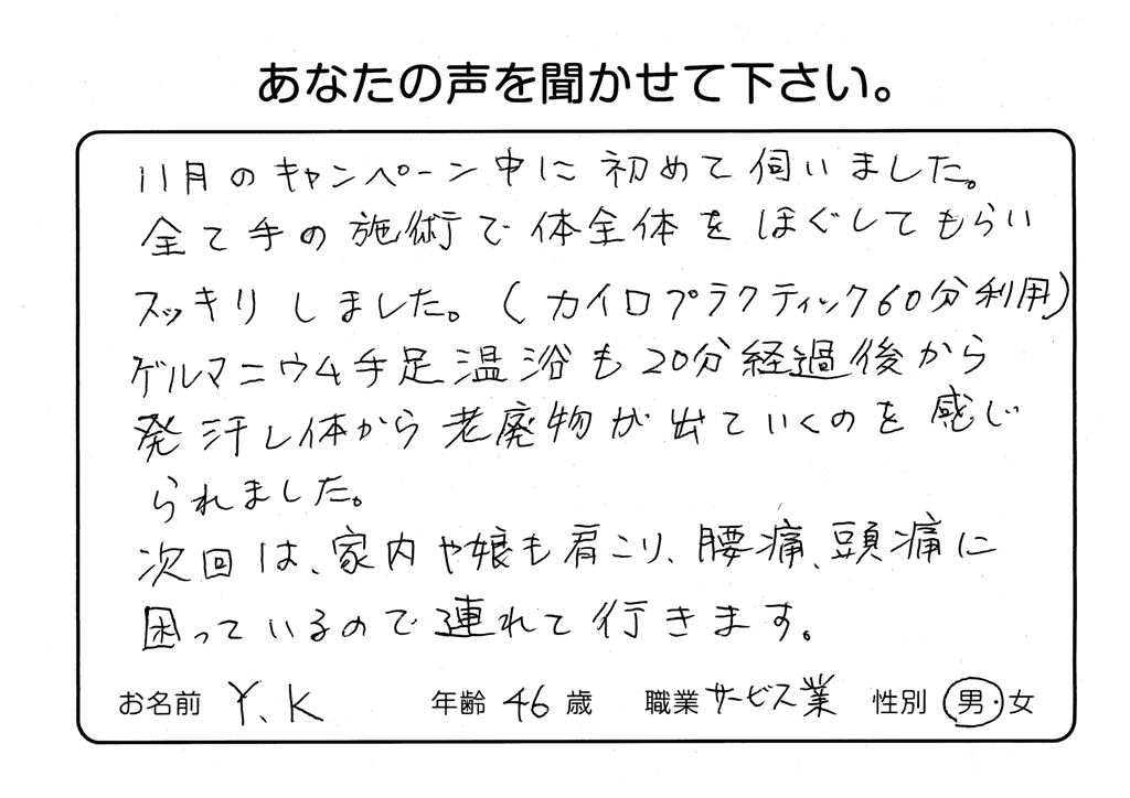 たくさんのお言葉ありがとうございます。実際に見て感じた事を言葉に表す事って簡単な事ではないですね!みなさん一生懸命に書いていただいた事が無駄にならないよう施術させていただきます。