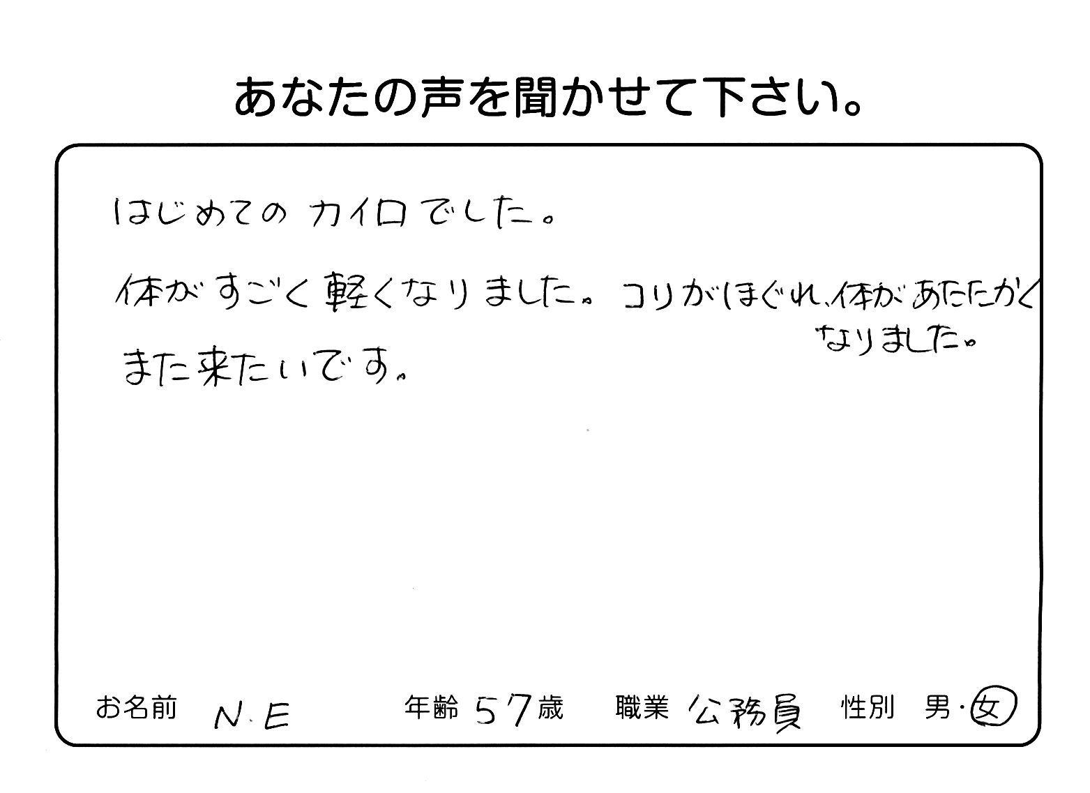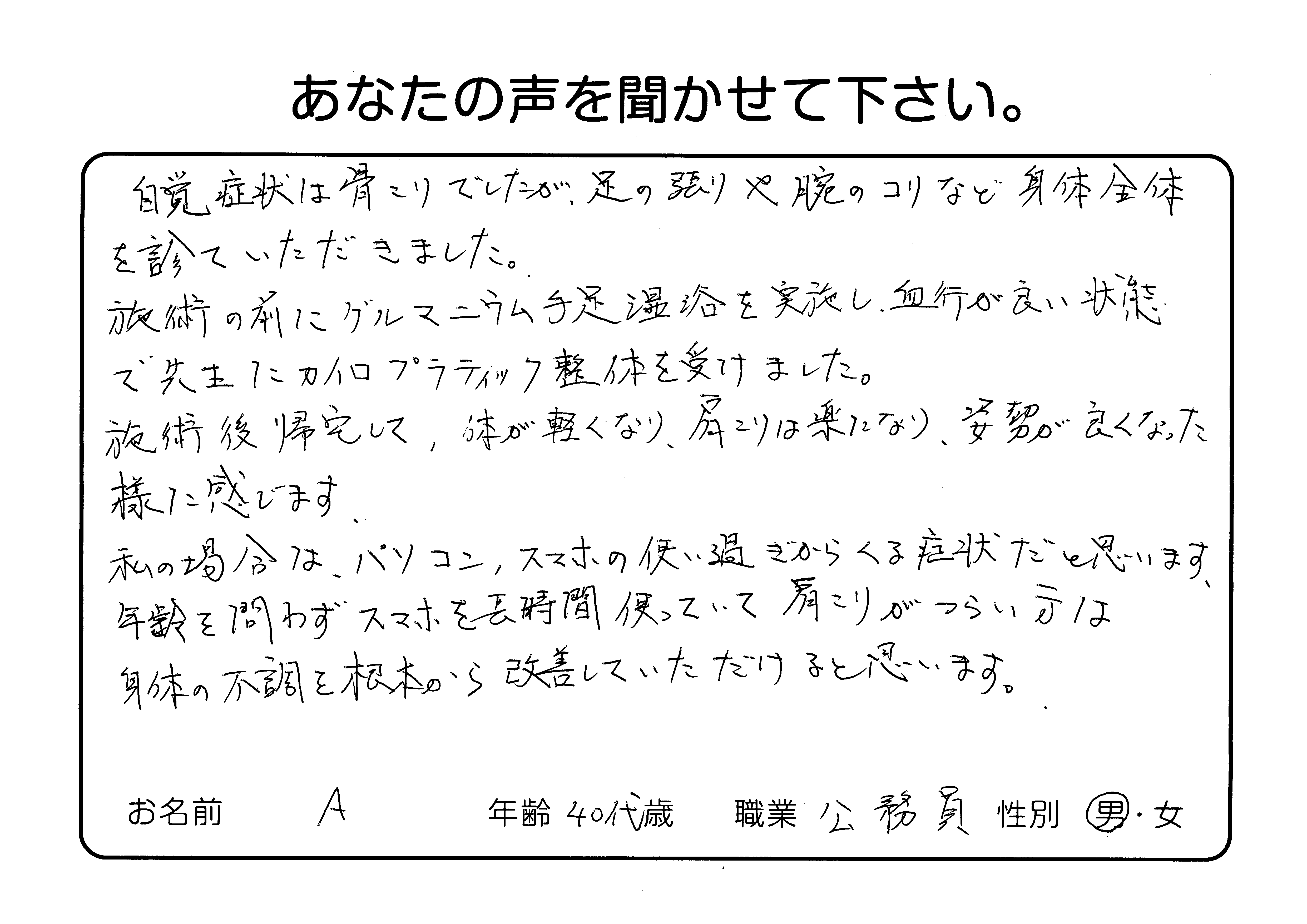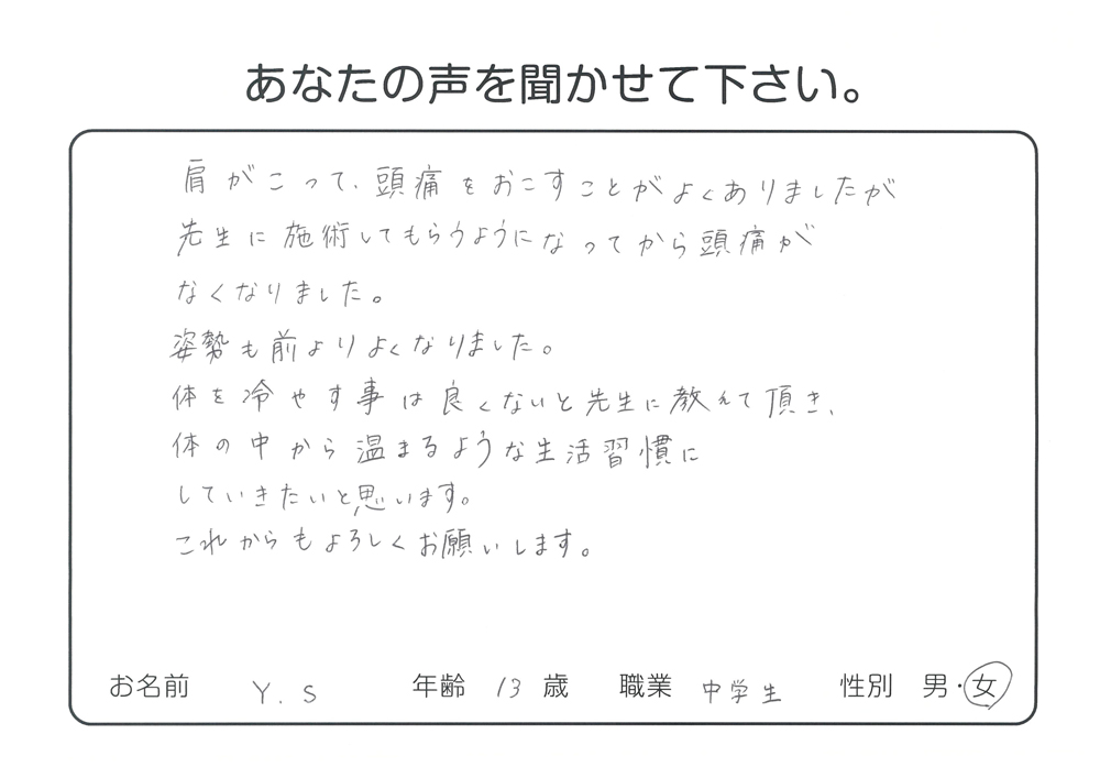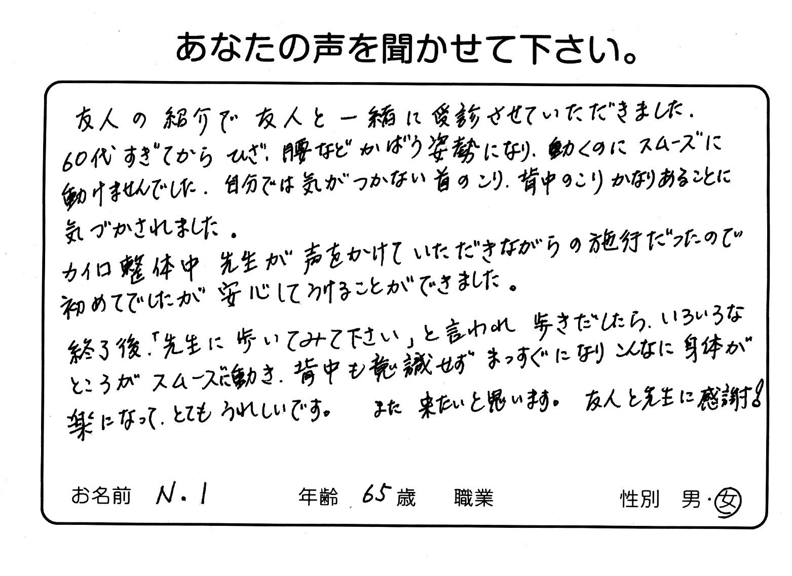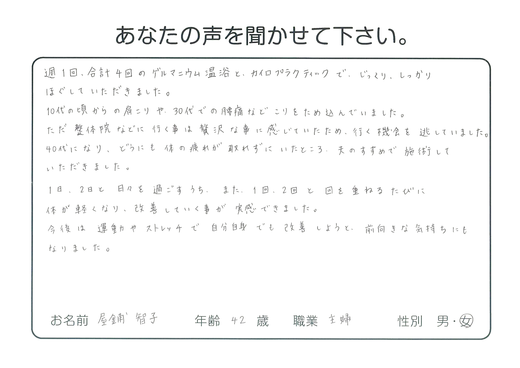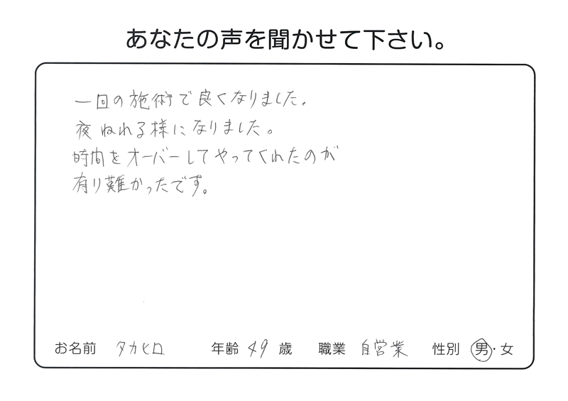 たくさんのお言葉ありがとうございます。実際に見て感じた事を言葉に表す事って簡単な事ではないですね!みなさん一生懸命に書いていただいた事が無駄にならないよう施術させていただきます。