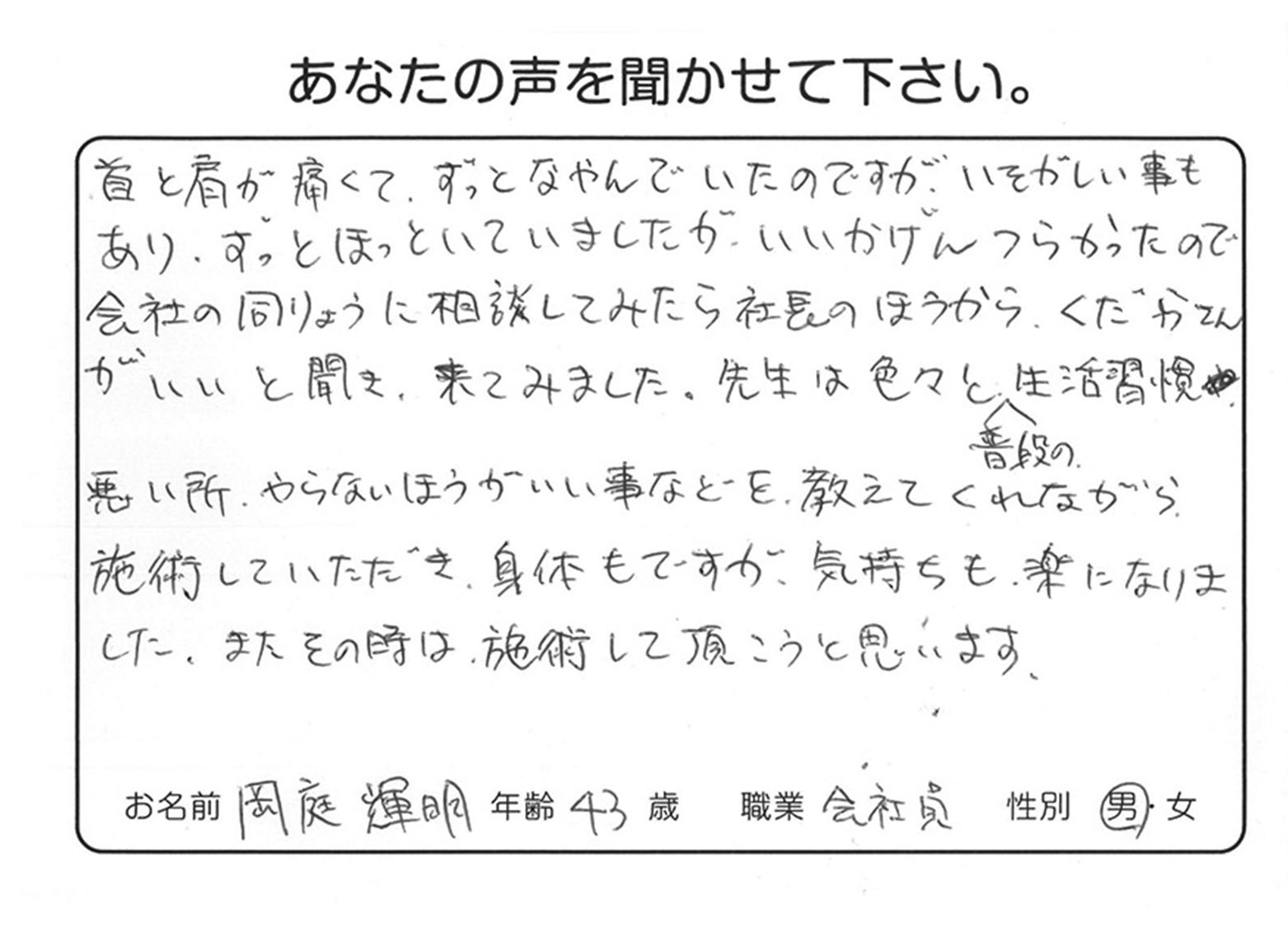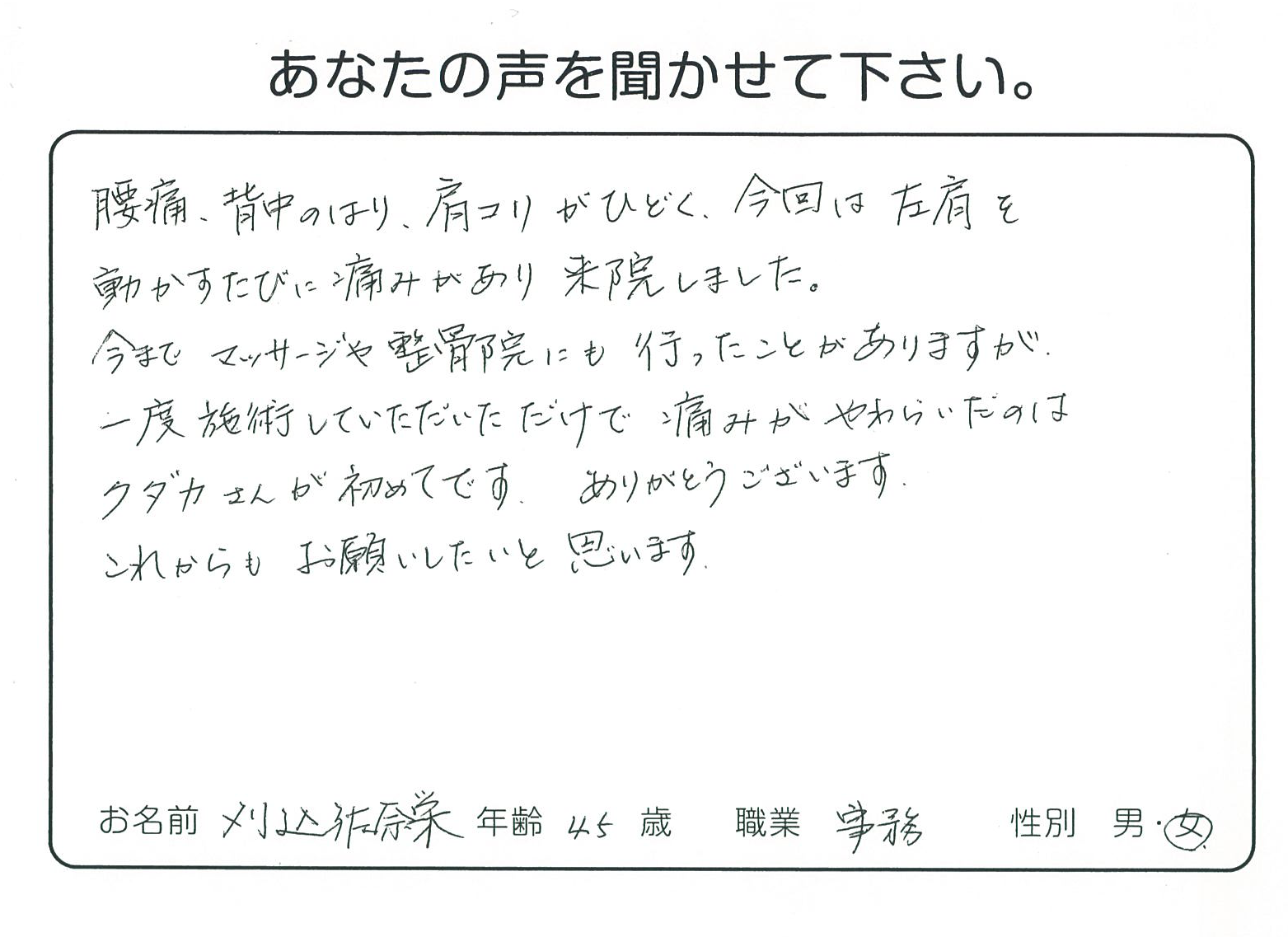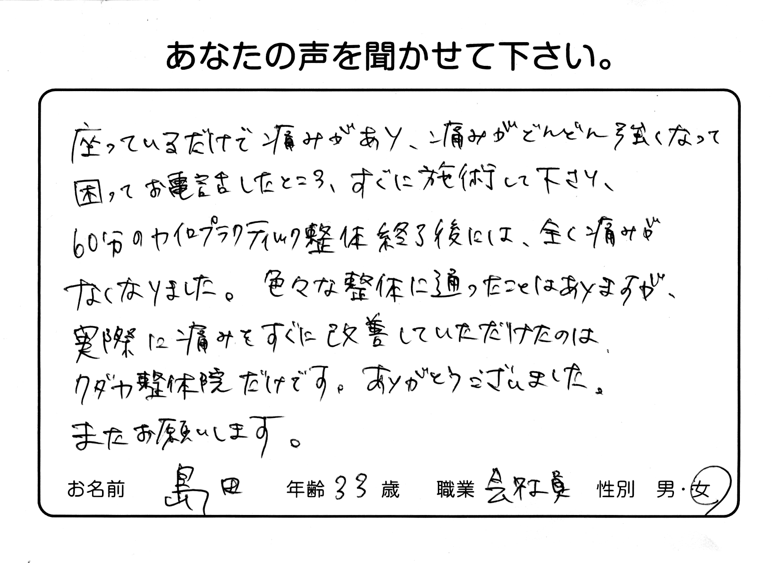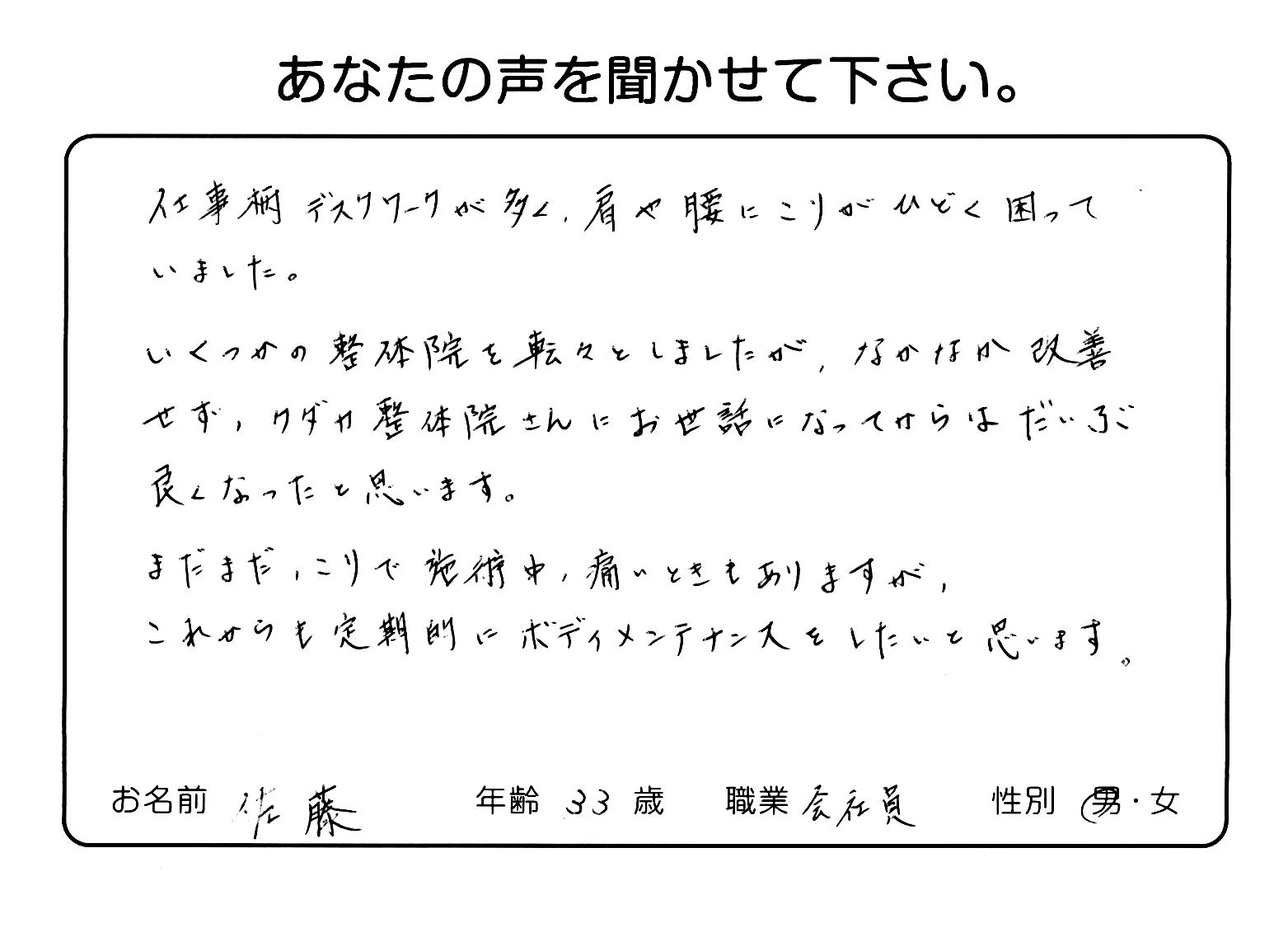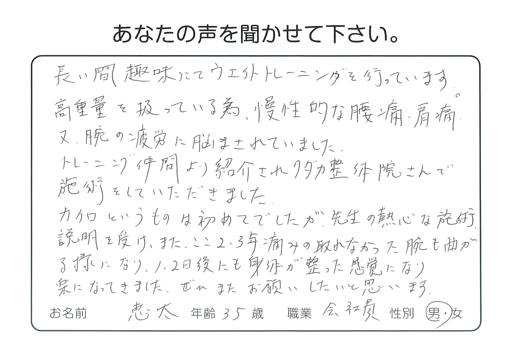 たくさんのお言葉ありがとうございます。実際に見て感じた事を言葉に表す事って簡単な事ではないですね!みなさん一生懸命に書いていただいた事が無駄にならないよう施術させていただきます。