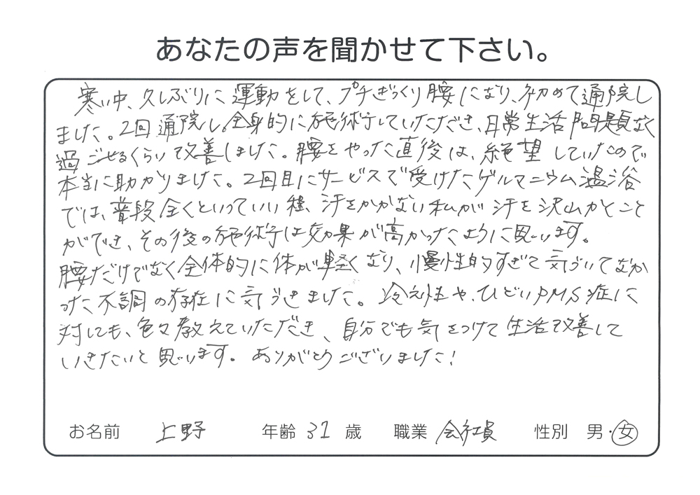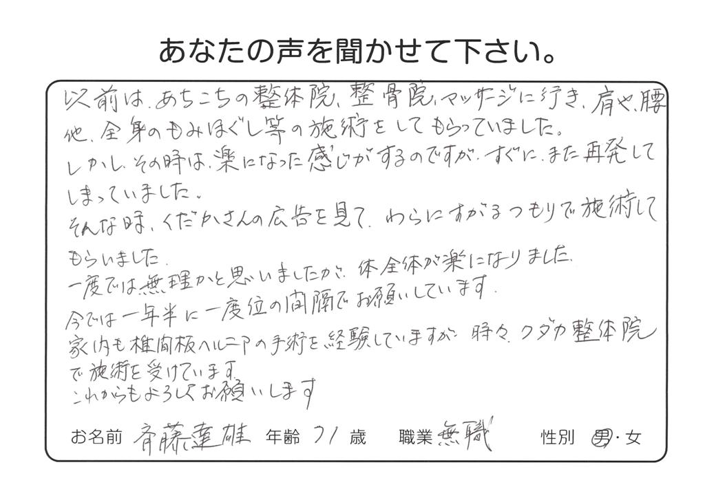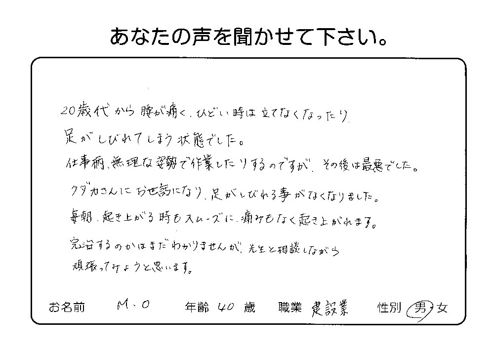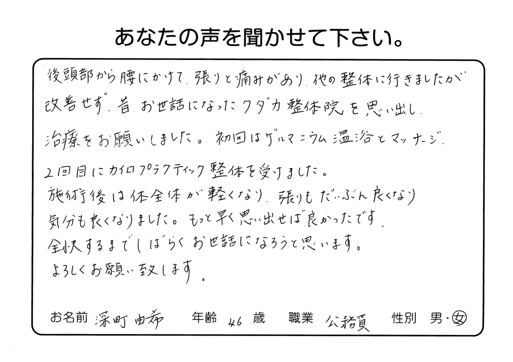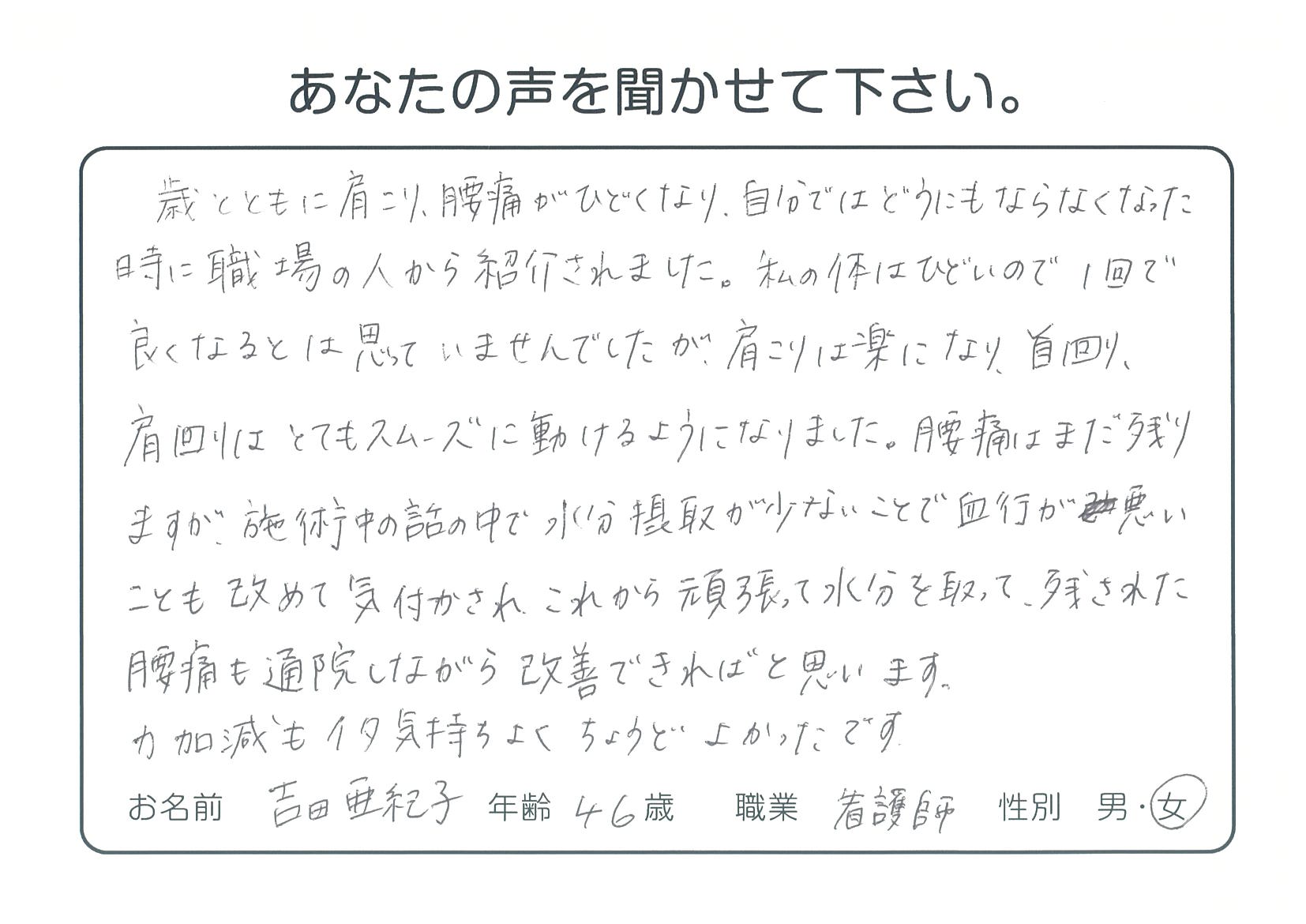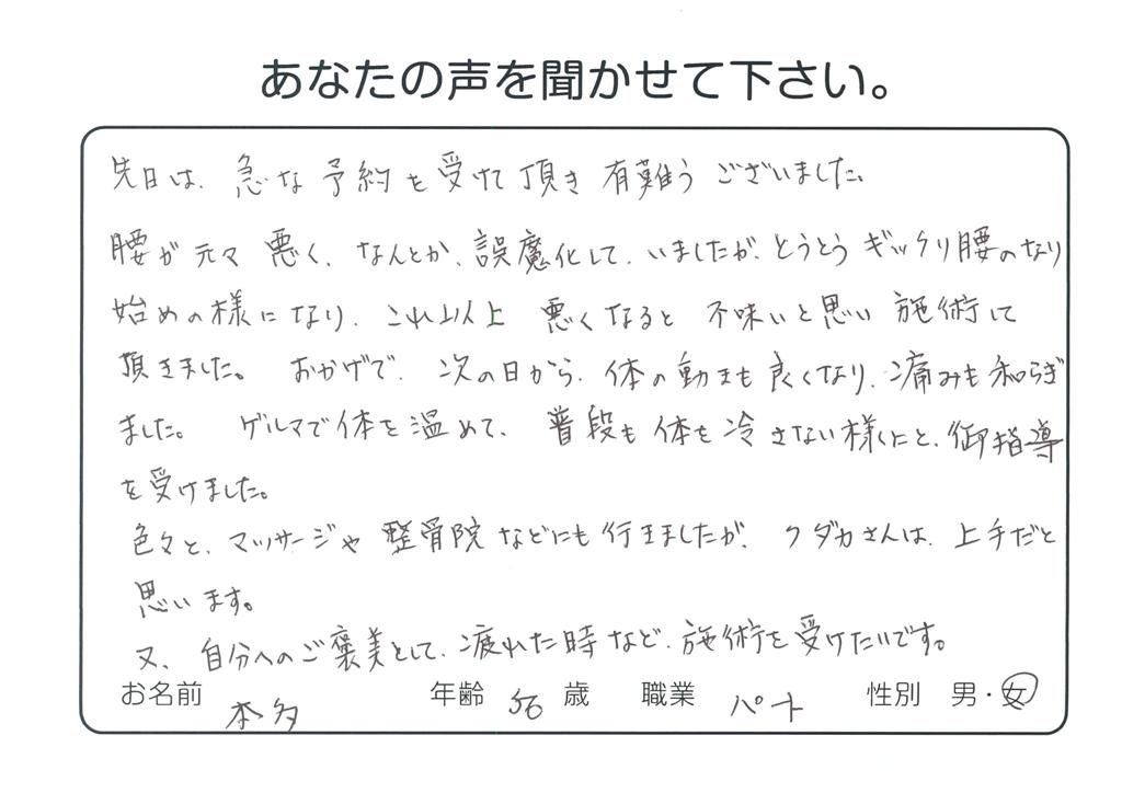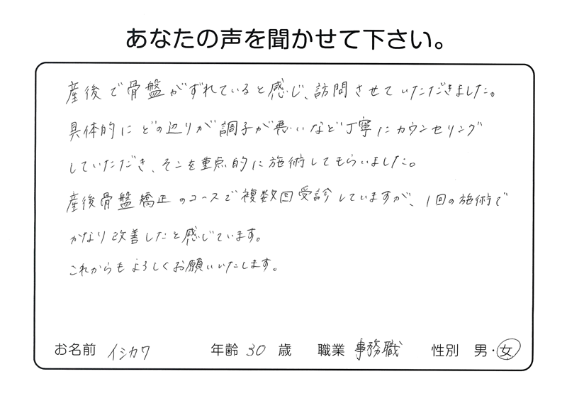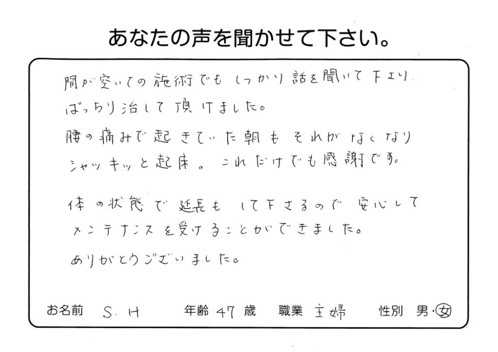 たくさんのお言葉ありがとうございます。実際に見て感じた事を言葉に表す事って簡単な事ではないですね!みなさん一生懸命に書いていただいた事が無駄にならないよう施術させていただきます。